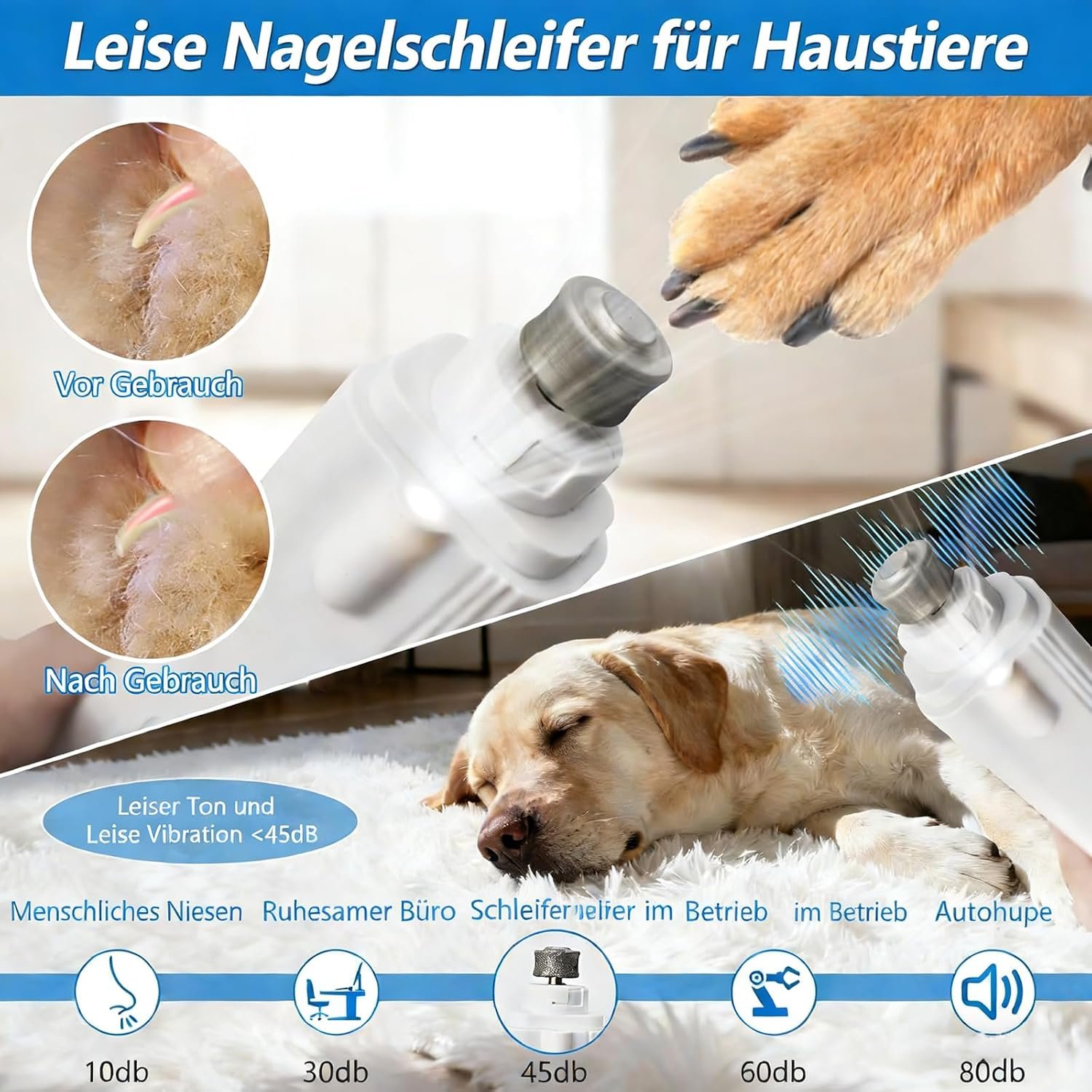 Ultra-leiser Betrieb: Die Hunde-Lichtschere arbeitet flüsterleise, minimiert Stress und Ängste bei geräuschempfindlichen Tieren und sorgt auch bei nervösen Hunden für eine ruhige, kontrollierte Pfotenpflege.