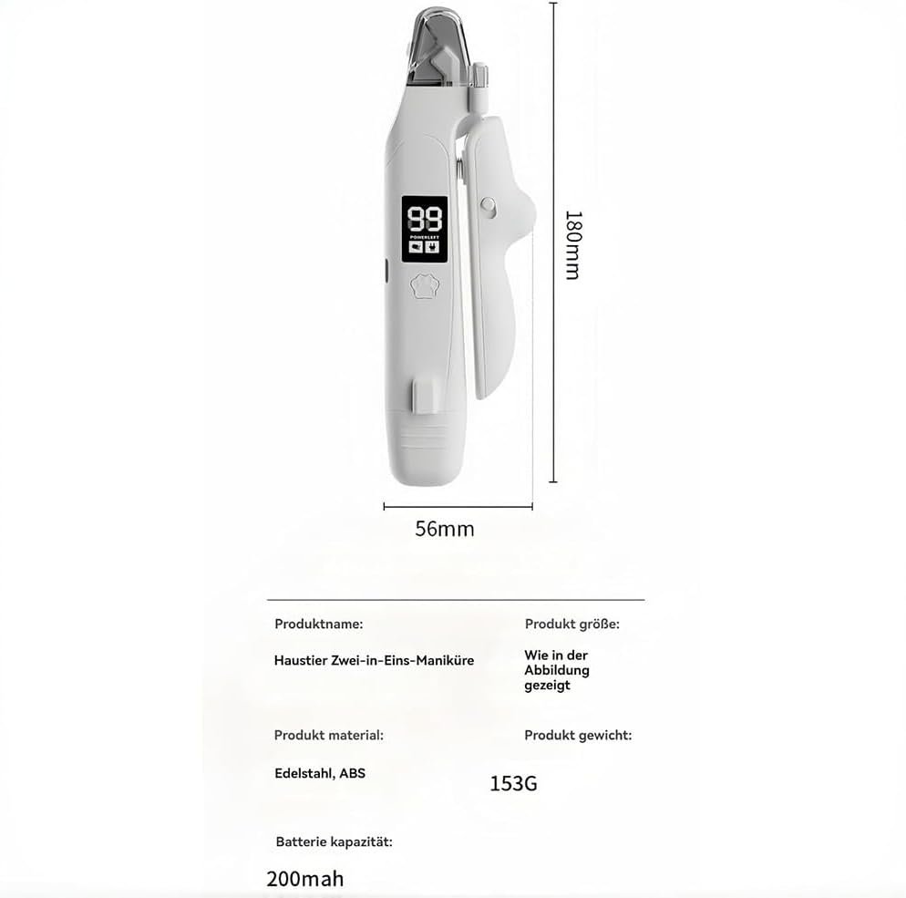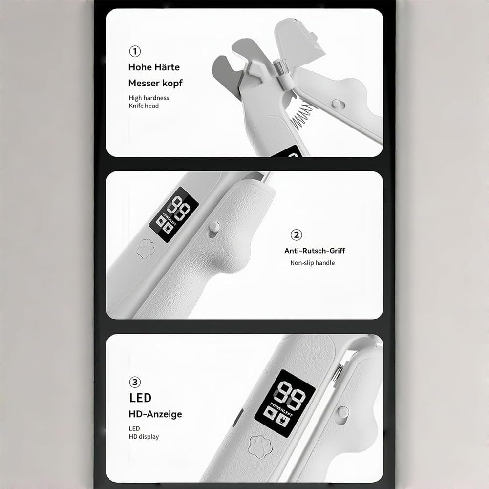 Elektrische Hundekrallenschere mit Licht – Blutgefäße sichtbar: Zwei eingebaute LED-Leuchten sorgen für optimale Sicht. Mit diesem Krallenschleifer und -schneider können Sie die Blutgefäße in den Krallen Ihres Haustieres leicht erkennen. Dies gewährleistet ein präzises und sicheres Trimmen, verhindert übermäßiges Schleifen und versehentliche Schnitte und macht die Krallenpflege Ihres Haustieres stressfrei