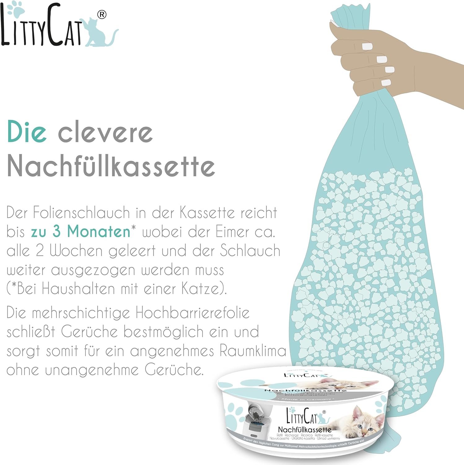 Der Folienschlauch in der Kassette hält bis zu 3 Monate (für Haushalte mit 1 Katze).