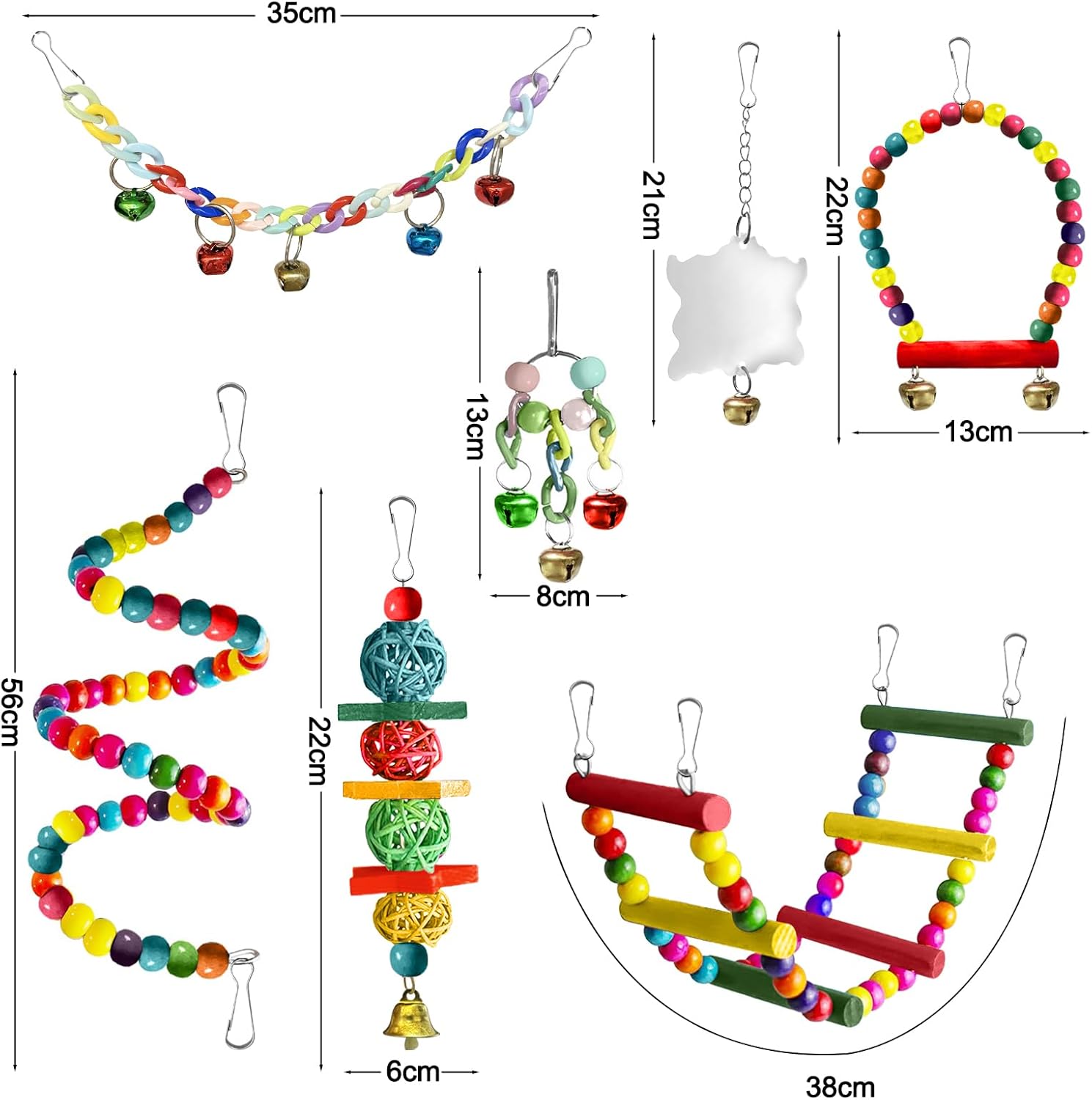 Dieses Vogelspielzeugset enthält 1 Vogelkletterleiter, 1 rotierende Holzperlenleiter, 1 Kauspielzeug, 1 Hängespielzeug mit Glocken, 2 Vogelschaukelspielzeuge und 1 Spiegelspielzeug. Sie können weiterhin schaukeln, klettern, ziehen, kauen, nach Nahrung suchen, daran kratzen, diese Spielzeuge schütteln und von einem Spielzeug zum anderen springen.