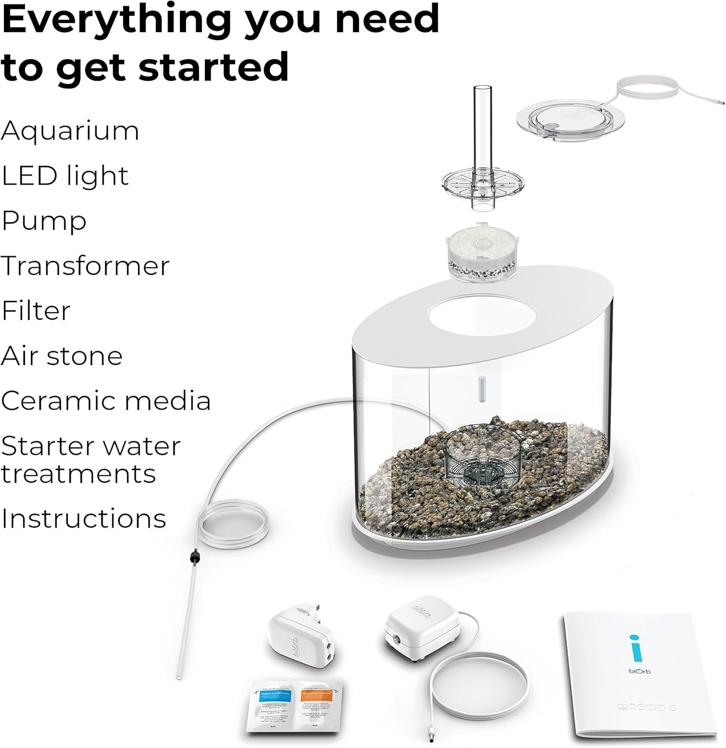 Das dekorative Aquarium-Starterset beinhaltet: Acrylglasbecken, Pumpe, Transformator, Ausströmerstein, Filterkartusche und Keramiksockel. Das Mini-Aquarium ist einfach zu montieren.