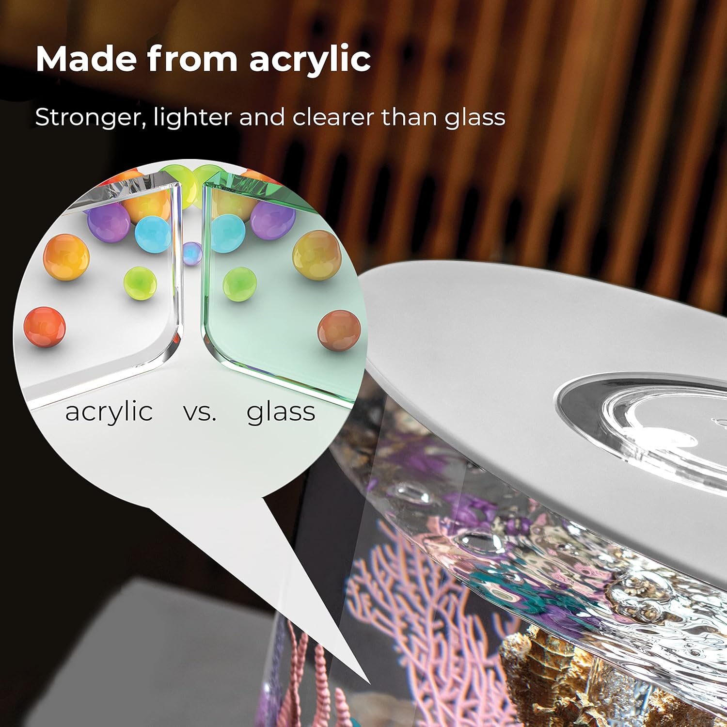 Darüber hinaus lässt das Acrylglas 23 % mehr Licht durch als ein Standard-Glasaquarium, sodass Sie die Farben in Ihrem Aquarium auf eine Weise sehen können, die Sie vielleicht noch nie zuvor gesehen haben.