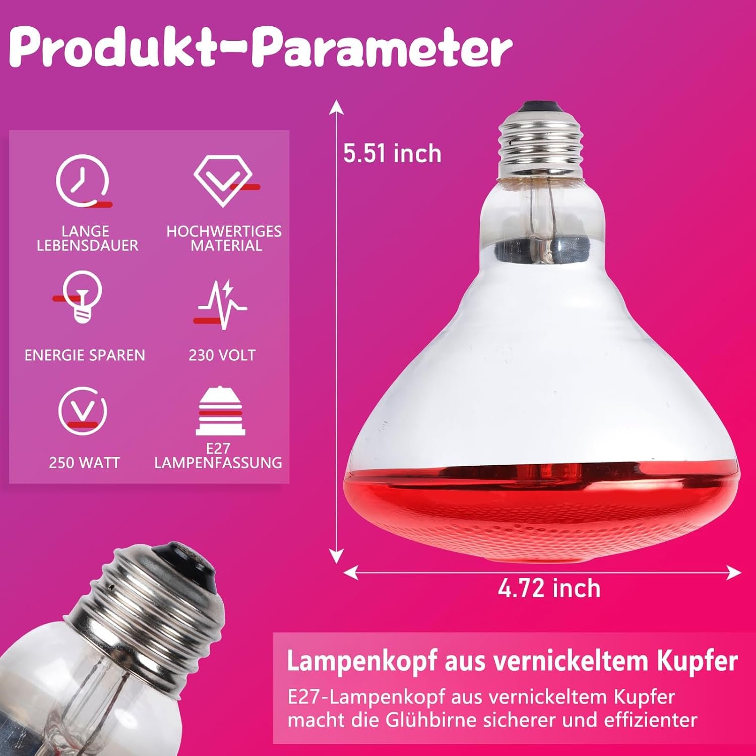 Einführung in die Sicherheit – die Wärmelampe LUCKY HERP für Hühner besteht aus hochwertigem Glasmaterial und hat eine lange Lebensdauer. Verwendet Standard-E27-Fassung, 220–230 Volt, einfach zu installieren. Achten Sie bei der Verwendung von Infrarotlampen darauf, dass Sie eine hochwertige Keramiklampenfassung verwenden und vermeiden Sie das wiederholte Ausschalten der Lampe, um die Lebensdauer der Lampe zu verlängern. Bitte halten Sie einen angemessenen Abstand, insbesondere zu Haustieren oder Lebensmitteln, um eine mögliche Nichtexistenz oder Sicherheitsgefährdung durch übermäßige Hitze zu vermeiden.