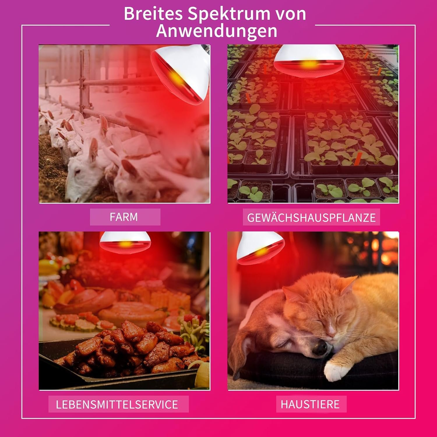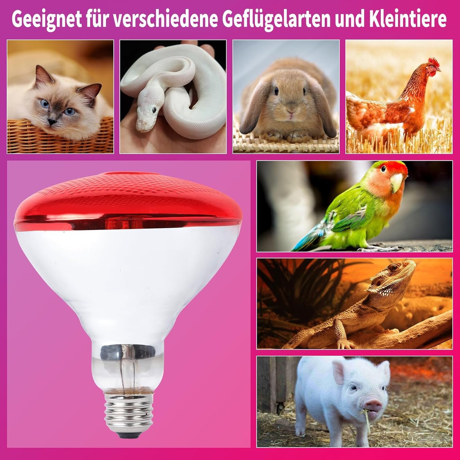 Breite Anwendung: Diese rote Infrarot-Wärmelampe eignet sich nicht nur für verschiedene Geflügelarten, Haustiere wie Katzen und Hunde und kleine Säugetiere wie Kaninchen, sondern kann auch Reptilien wie Bartagamen, Eidechsen, Schlangen und andere Reptilien erwärmen, während sie gleichzeitig das kräftige Wachstum von Gewächshauspflanzen fördert, das Pflanzenpotenzial stimuliert und eine hervorragende Rolle bei der Lebensmittelisolierung in der Lebensmittelindustrie spielt.