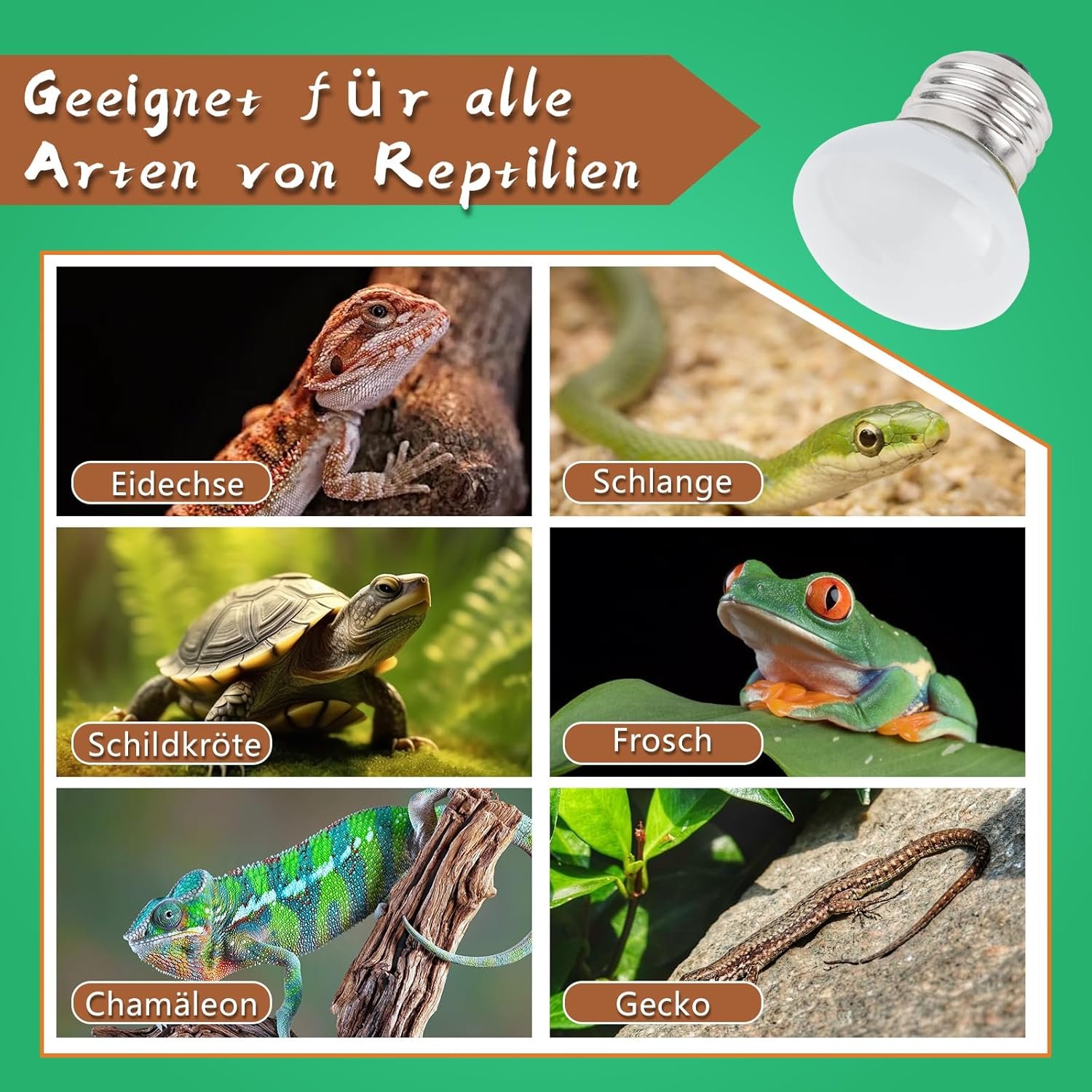 VIELSEITIG – Die 25-W-Wärmelampe eignet sich für kleinere Terrarien und ermöglicht eine präzisere Temperaturregelung, um eine Überhitzung zu vermeiden, die zu Unwohlsein oder Verletzungen der Reptilien führen könnte. Ob tropischer Regenwald oder trockene Wüste, unsere Reptilien-Wärmelampen können an die Bedürfnisse aller Futterplätze angepasst werden. Geeignet für alle Arten von Reptilien und Amphibien, einschließlich Bartagamen, Geckos, Schlangen, Schildkröten, Eidechsen, Chamäleons und Frösche.