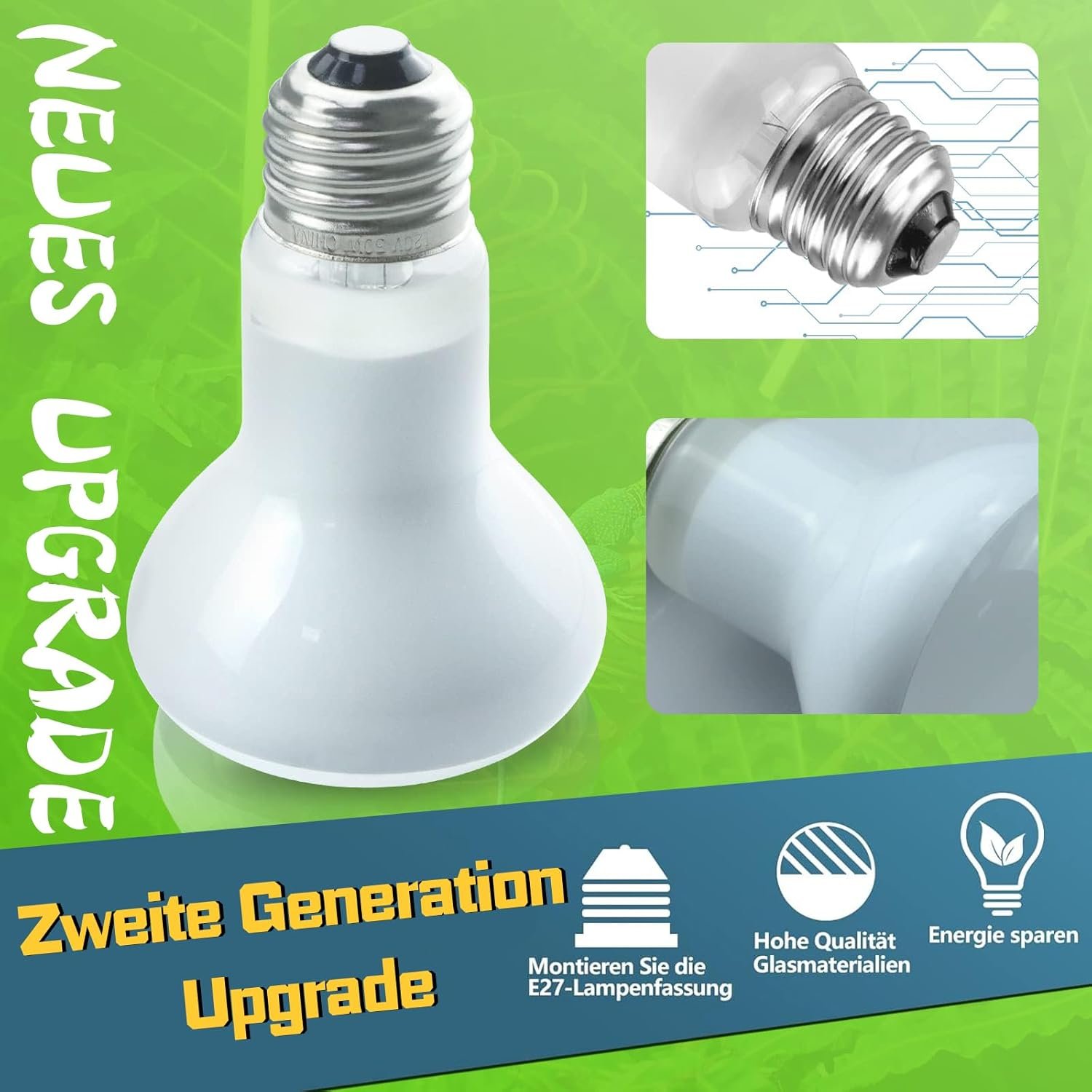 Hochwertige Reptilien-Wärmelampe – Unsere Wärmelampe für Reptilien besteht aus hochwertigen Glas- und Filamentmaterialien, um die Sicherheit bei der Verwendung zu gewährleisten. Die Wärmelampe hat eine hohe Haltbarkeit und kann kontinuierlich arbeiten und hat eine Lebensdauer von bis zu 2000 Stunden. Gleichzeitig durchläuft unsere Reptilienzwiebel Dutzende strenge Kontrollen und Sicherheitszertifizierungen, um die hohe Qualität und Sicherheit der Reptilienzwiebeln zu gewährleisten.