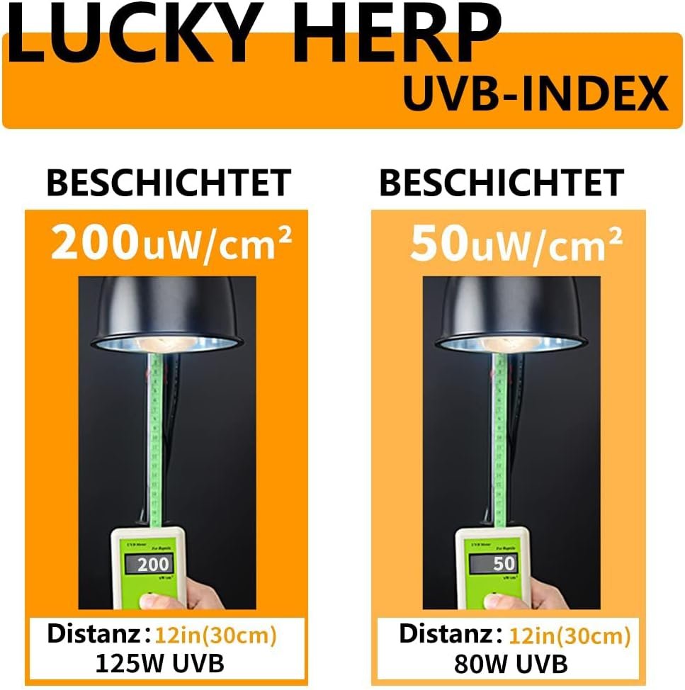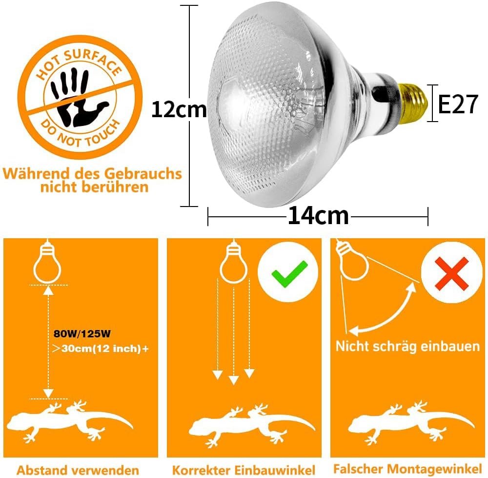 E27-Fassung: Bitte verwenden Sie für unsere UVB-Reptilienleuchte einen hochwertigen Keramiksockel. Bitte überprüfen Sie die Größe der 125-W-Quecksilberdampflampe und die Größe Ihrer Lampenfassung. Nicht mit Dimmern/Rheostaten zu verwenden.