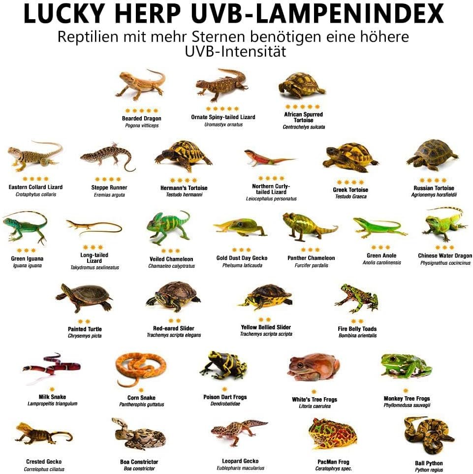 Ideal für fast alle Reptilien und Amphibien, unsere UVA-UVB-Lampe ist ideal für Bartagamen, Landschildkröten, Wasserschildkröten, Geckos, Leguane, Eidechsen, Chamäleons, auch für Frösche, Kröten, Schlangen und mehr geeignet.