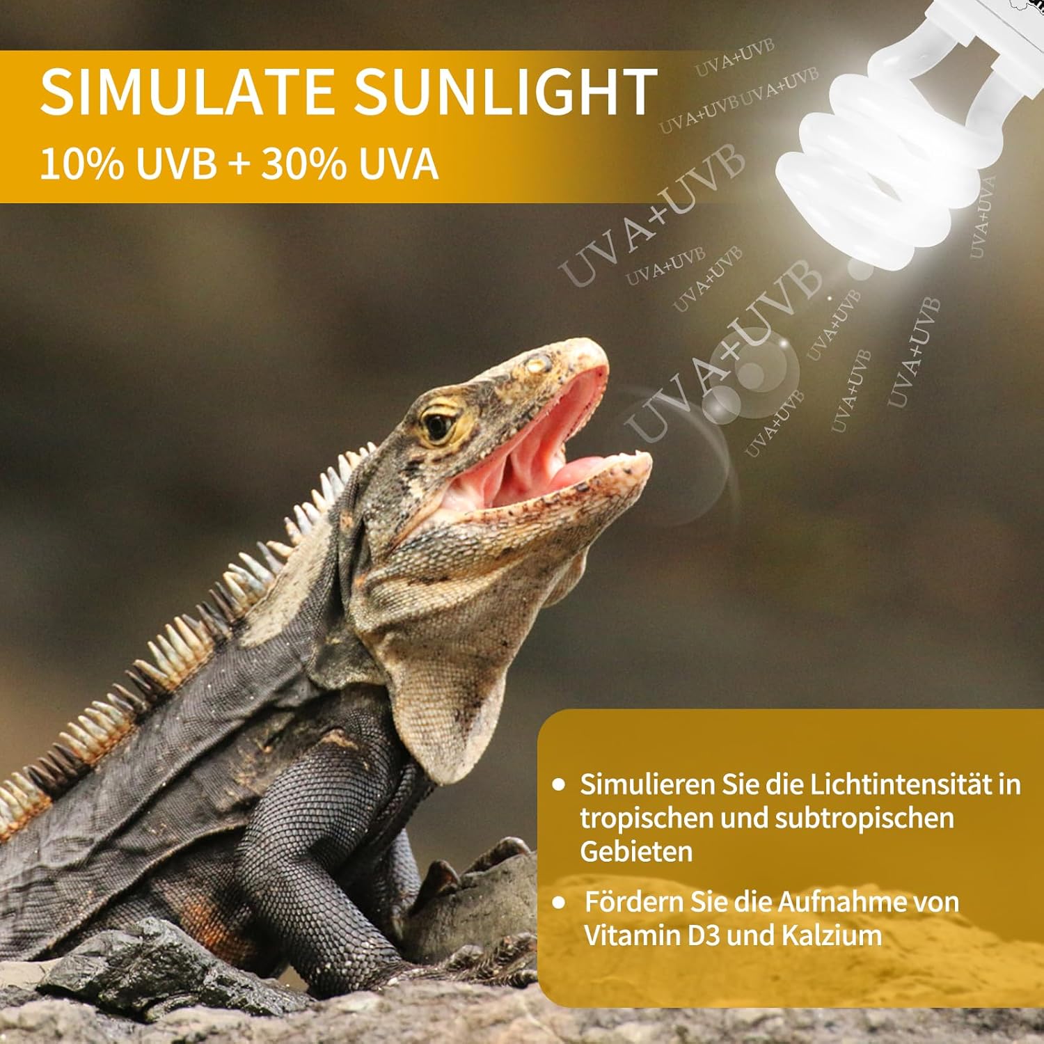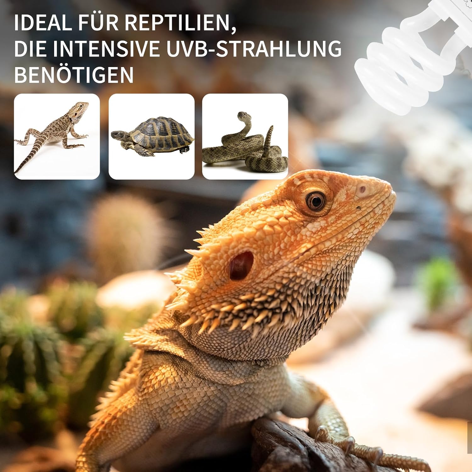 Perfektes tropisches UVB-Reptilienlicht: 10 % UVB- und 30 % UVA-Leistung. Keine schädliche UVC-Leistung.