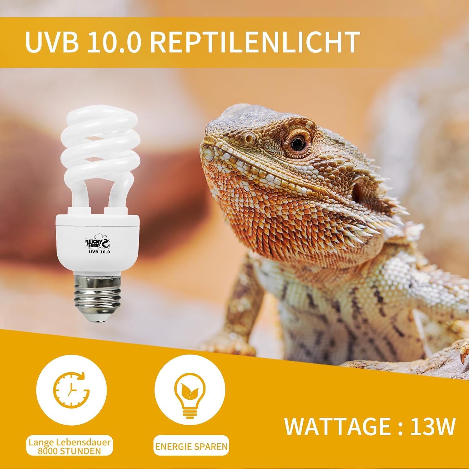 Reptilien-UVB-10.0-Glühbirne, ideal für alle tropischen und subtropischen Reptilien wie Chamäleons, Schildkröten und andere Eidechsen.