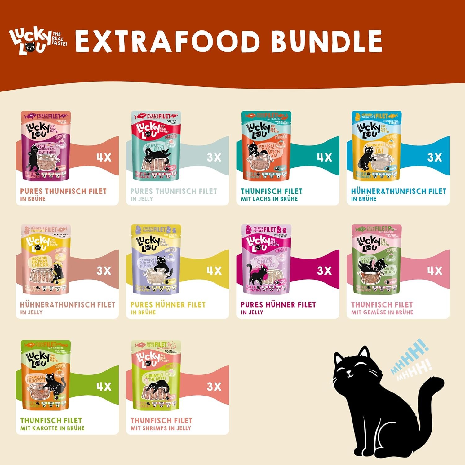 Hey, ich bin es – Lucky Lou. Du kannst mich auch einfach Lucky oder Lou nennen, wie du möchtest. Ich bin sehr entspannt. Cheatday – Mega-Meatday… Wir Katzen verwöhnen uns gerne. Du magst ein richtiges Fest zwischendurch, oder? Genau so machen wir Katzen es. Wir lieben Extras! Und deshalb habe ich mein Nassfuttersortiment um Lucky Lou Extra Food ergänzt. Du stehst auf Soulfood, wir Katzen stehen auf saftiges Filet. Mir geht es so. Und damit es besonders zart wird, gibt es zwei Zubereitungsvarianten: in Gelee und in Brühe. Extra lecker, sag ich dir! Selbstverständlich sind die Zutaten auch für Katzen geeignet. Kein Getreide, kein Reis, kein zugesetzter Zucker – das gibt es bei mir nicht aus der Dose. Aber viel Fleisch und Fisch! Besonders Fischliebhaber kommen auf ihre Kosten, denn ich habe Thunfisch mit vielen Leckereien kombiniert. Zum Beispiel mit Lachs, Garnelen oder Hähnchenfilet. Auch Thunfisch mit Apfel oder Gemüse ist erhältlich. Es ist für jeden etwas dabei, klar. Und wenn Ihre Katze keinen Fisch mag, geben Sie ihr als Extrafutter Hähnchenfilet. Für einen besonders saftigen Sud habe ich das Ganze mit Tapioka garniert. Wichtig für meinen Speiseplan: Extra-Essen ist ein Extra. Es handelt sich also um ein Ergänzungsfuttermittel, das die normale tägliche Futterration bereichern soll. Für eine ausgewogene Ernährung Ihrer Katze mit allen notwendigen Nährstoffen ist daher die Kombination mit Lucky Lou Lifestage, SuperMono oder My Ultimate Food Code ideal. Langweiliges One-Size-Futter gibt es woanders – Lucky Lou Extra Food gibt es in 11 verschiedenen Sorten in der 70-g-Dose und jetzt auch im Beutel mit extra Sichtfenster. Für diesen zusätzlichen Cheat.