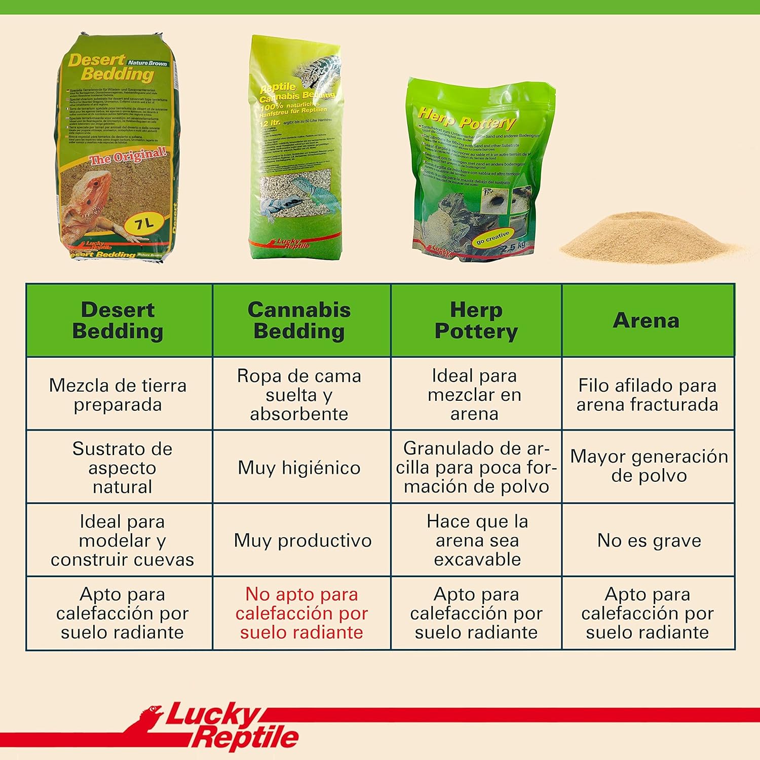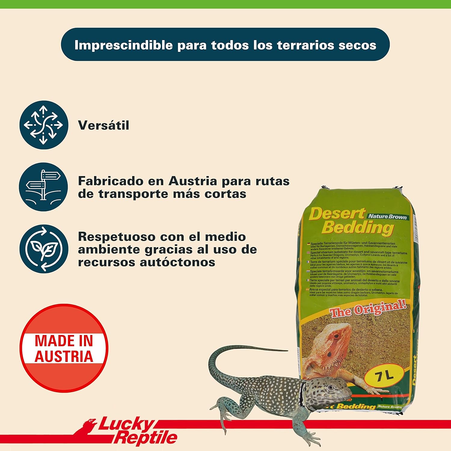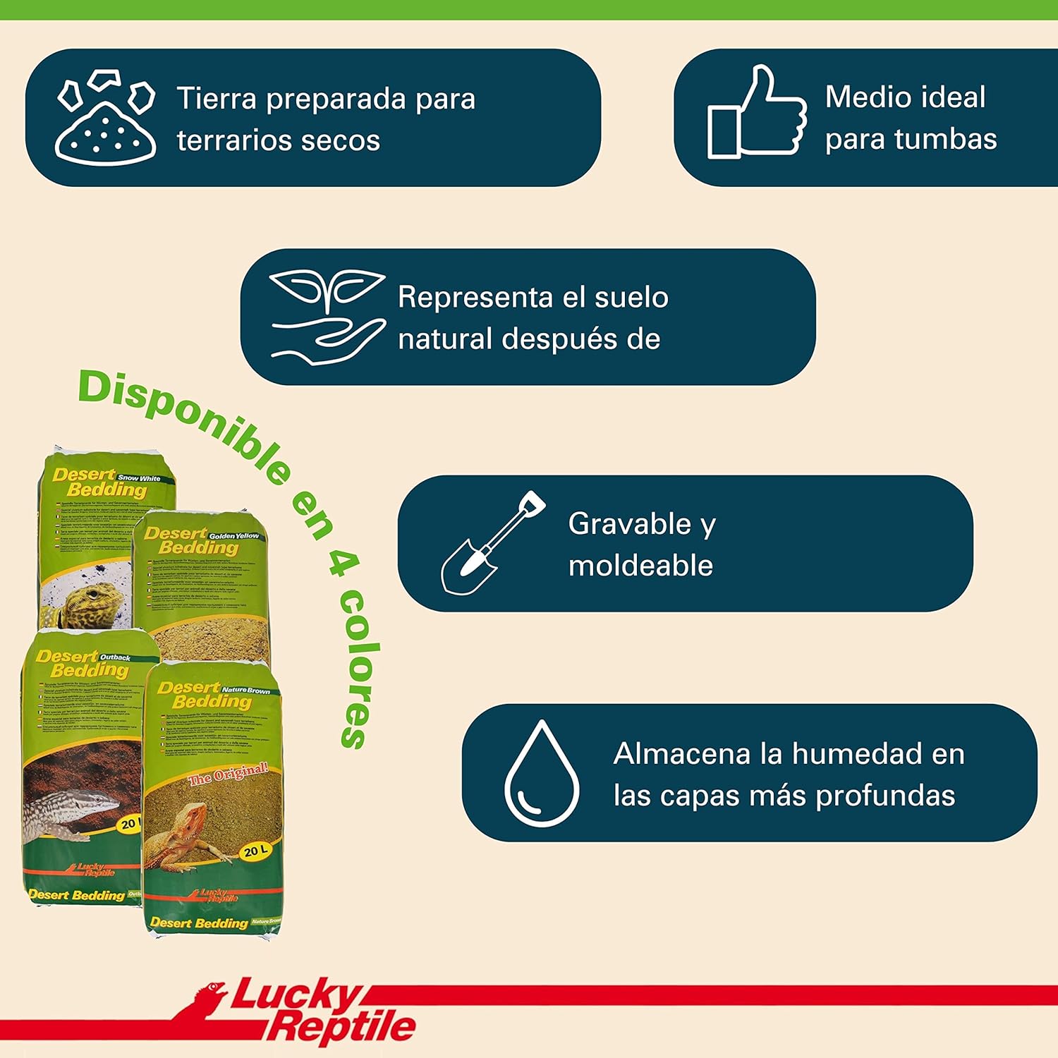 Desert Bedding ist dem Boden der Lebensräume von Wüsten- und Savannentieren nachempfunden und macht das Terrarium zu einem sehr natürlich wirkenden Biotop. Dank des hohen Tonanteils ist Desert Bedding besonders gräbfreudig und ermöglicht den Tieren das Anlegen von Höhlen. Darüber hinaus speichert es Feuchtigkeit, ein Vorteil, der für viele Arten sehr wichtig ist. Die Lucky Reptile Desert Bedding eignet sich auch hervorragend als Brutsubstrat und kann mit Fußbodenheizung genutzt werden.