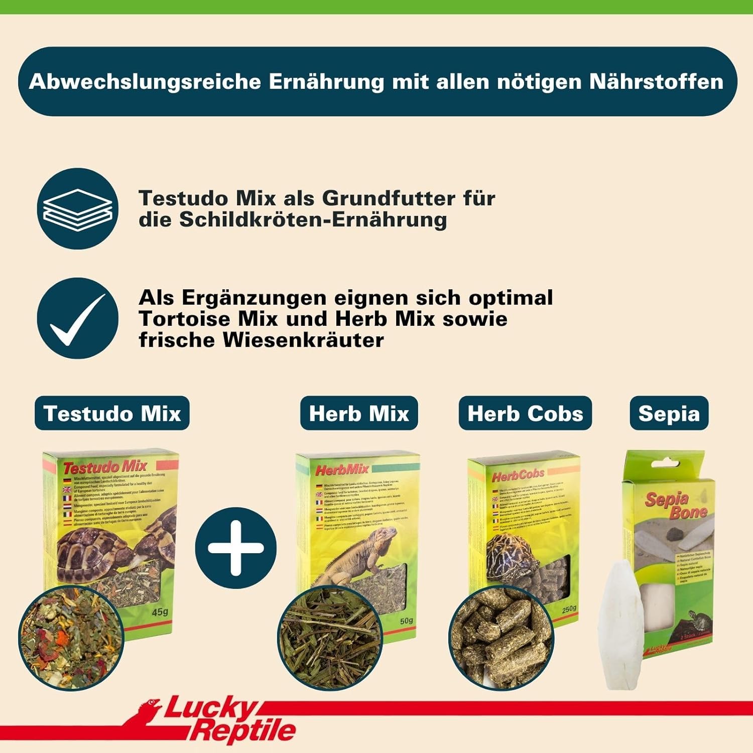 Wichtig: Europäische Landschildkröten sollten gesund und abwechslungsreich ernährt werden. Bieten Sie ihnen außerdem die Lucky Reptile Sepia Produkte & PRO Mineral sowie Lucky Reptile Herb Cobs & Herb Mix an.