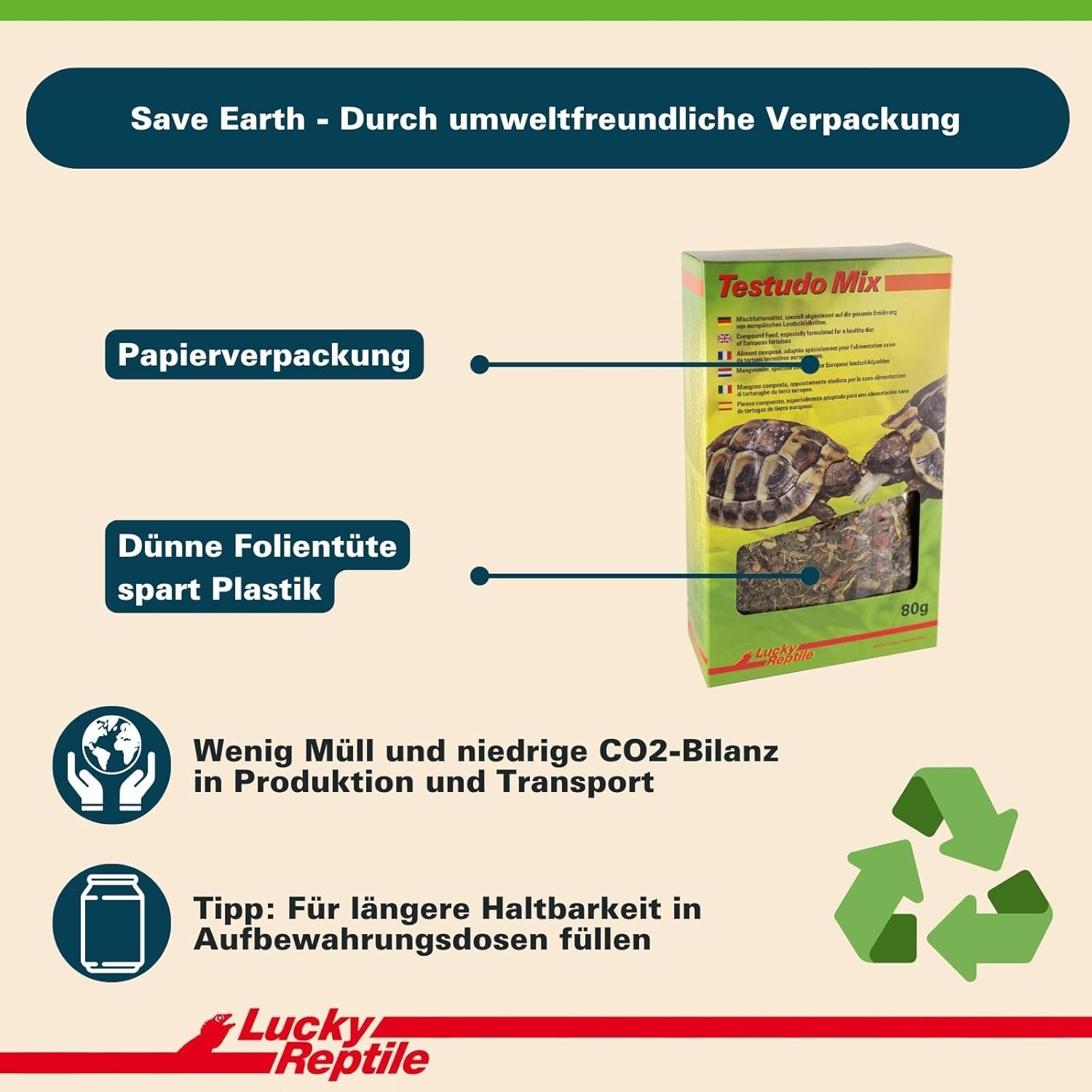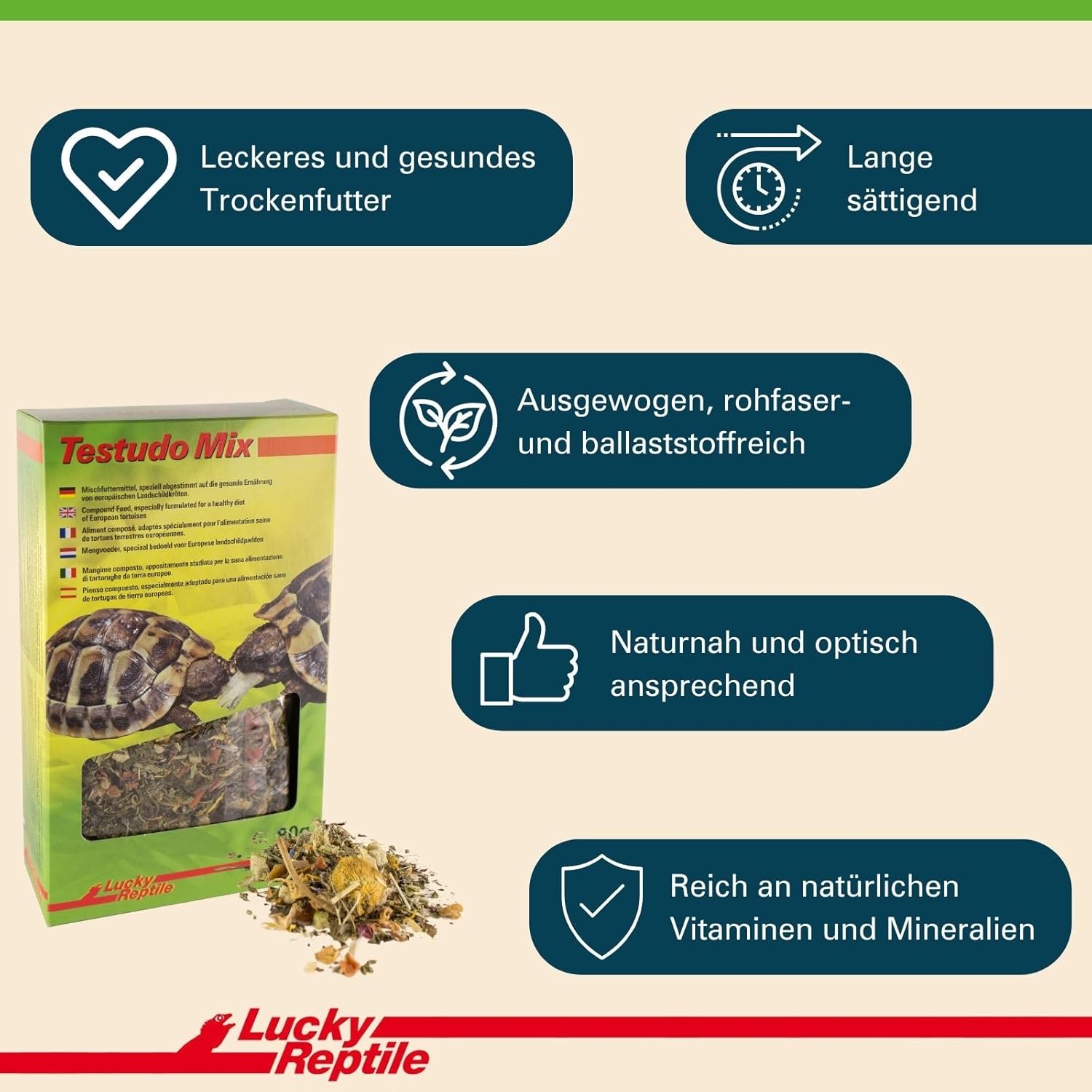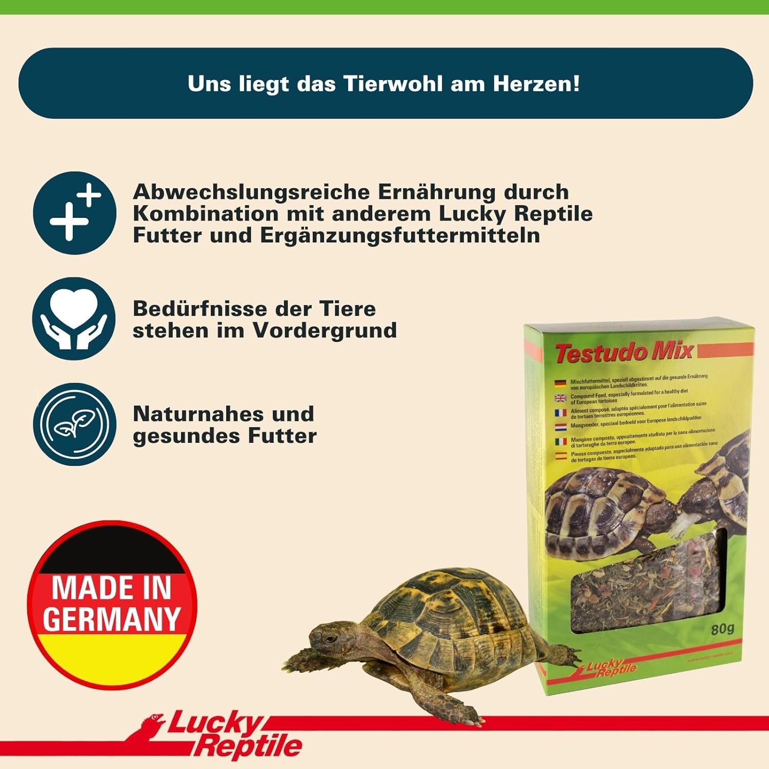 Fütterungsempfehlung: Testudo Mix kann trocken oder angefeuchtet verfüttert werden. Wir empfehlen, das optisch ansprechende und gesunde Schildkrötenfutter mit etwas Wasser zu besprühen, damit es seinen Geruch voll entfalten kann.