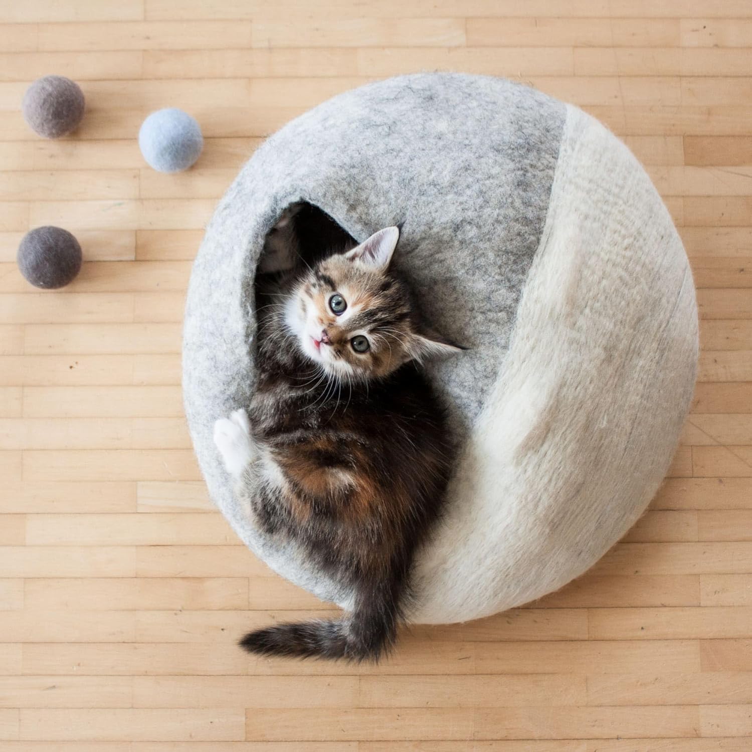 Zeitloses Design. Die Filzkatzenbälle sind in den dezenten Pastellfarben Taupe, Sand und Hellblau gehalten.