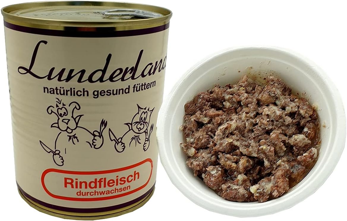 Durch den Gehalt an natürlichem Rinderfett (Mischfleisch – kein Fettzusatz). Eine ideale Dose für Hunde mit erhöhtem Energiebedarf. Kein Zusatz von Gemüse. Zusatzstoffe, Aromen, Farb- oder Konservierungsstoffe, synthetische Vitamine oder Mineralien. Hergestellt ohne Emulgatoren, Stabilisatoren, Salz, Proteinextrakte oder zugesetzte Fette. Eventuell aus dem verarbeiteten Fleisch austretende Feuchtigkeit oder Fette werden somit nicht verdeckt, sondern sind sichtbar, wie man das vom „Einkochen“ zu Hause kennt. Beide natürlichen Zutaten sollten gefüttert werden. Fütterungsempfehlung: Fleisch ist der Hauptbestandteil einer gesunden und artgerechten Ernährung, sollte jedoch durch Kohlenhydrate ergänzt werden. Die insgesamt benötigte Futtermenge (Fleisch und Zusatzstoffe) ist stark abhängig vom Alter, der Rasse und den Haltungsbedingungen. Analytische Bestandteile: Protein 20,3 %, Fettgehalt 16 %, Rohfaser 0,7 %, Rohasche 0,9 %, Feuchtigkeit 64,4 %, Calcium 0,03 %, Phosphor 0,13 %