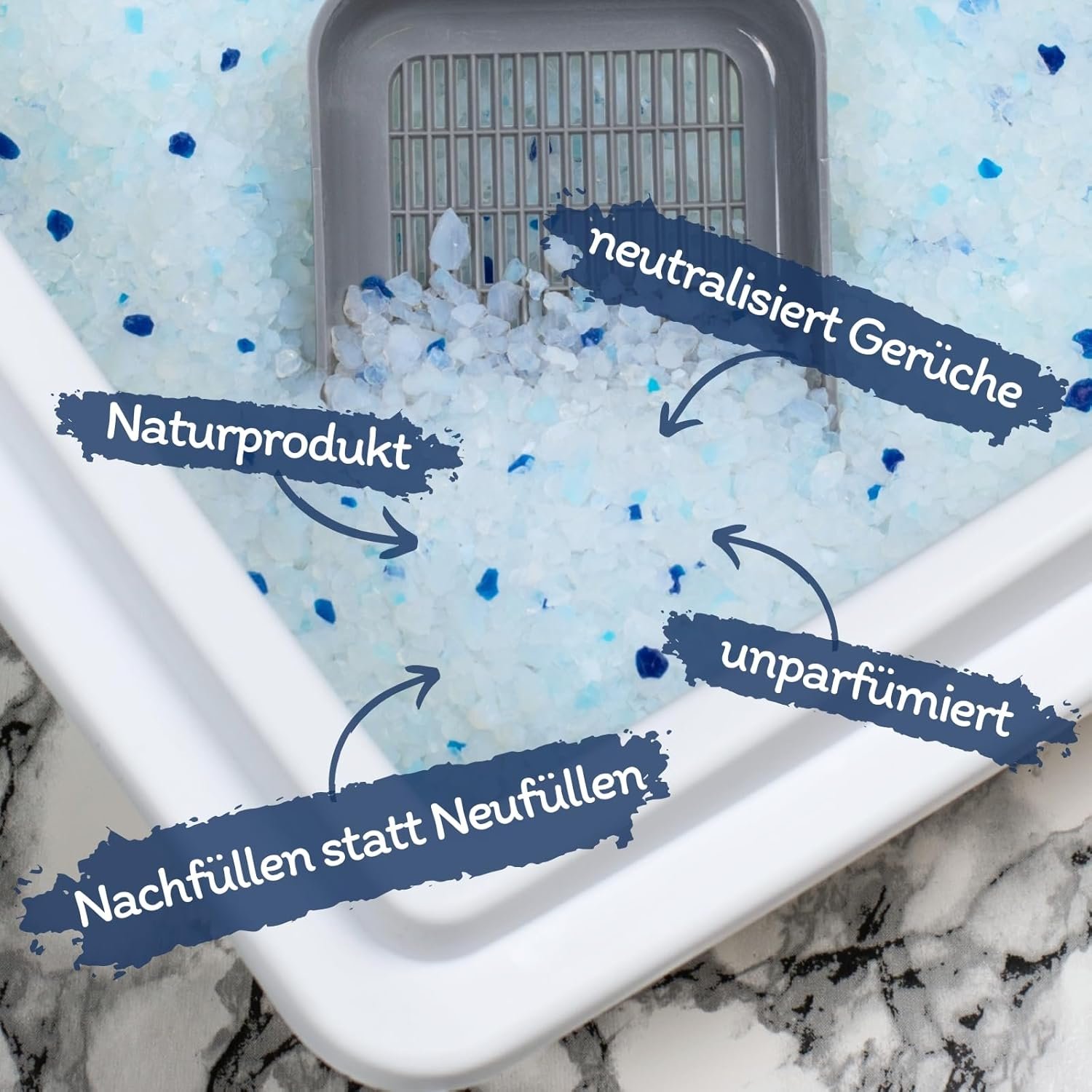 Jedes Mal, wenn Ihre Katze die Katzentoilette benutzt, wird die Nässe von den einzelnen vielporigen Körnern innerhalb von Sekunden aufgesaugt.