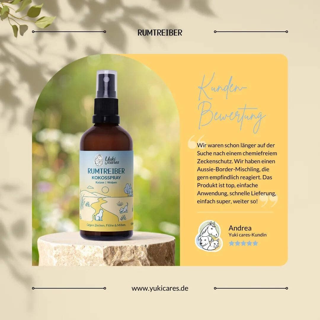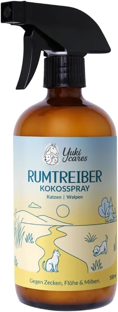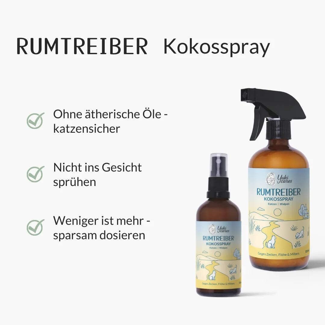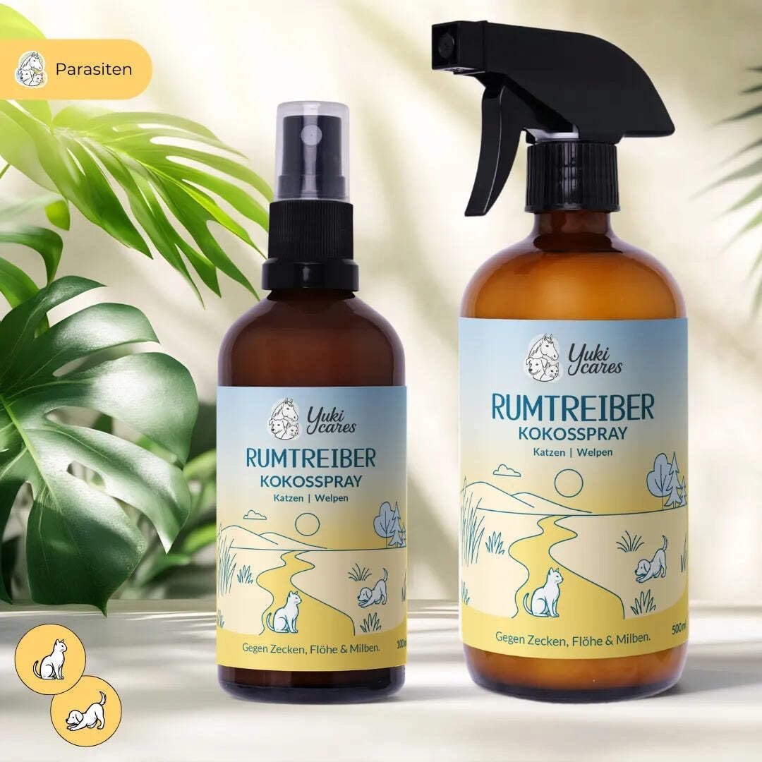 Kokosspray Plünderer von Yuki Cares – das wirksame Zeckenmittel für sanfte Pflege und Schutz vor Ektoparasiten. Natürlich und sicher für Katzen und Welpen unter 3 Monaten.