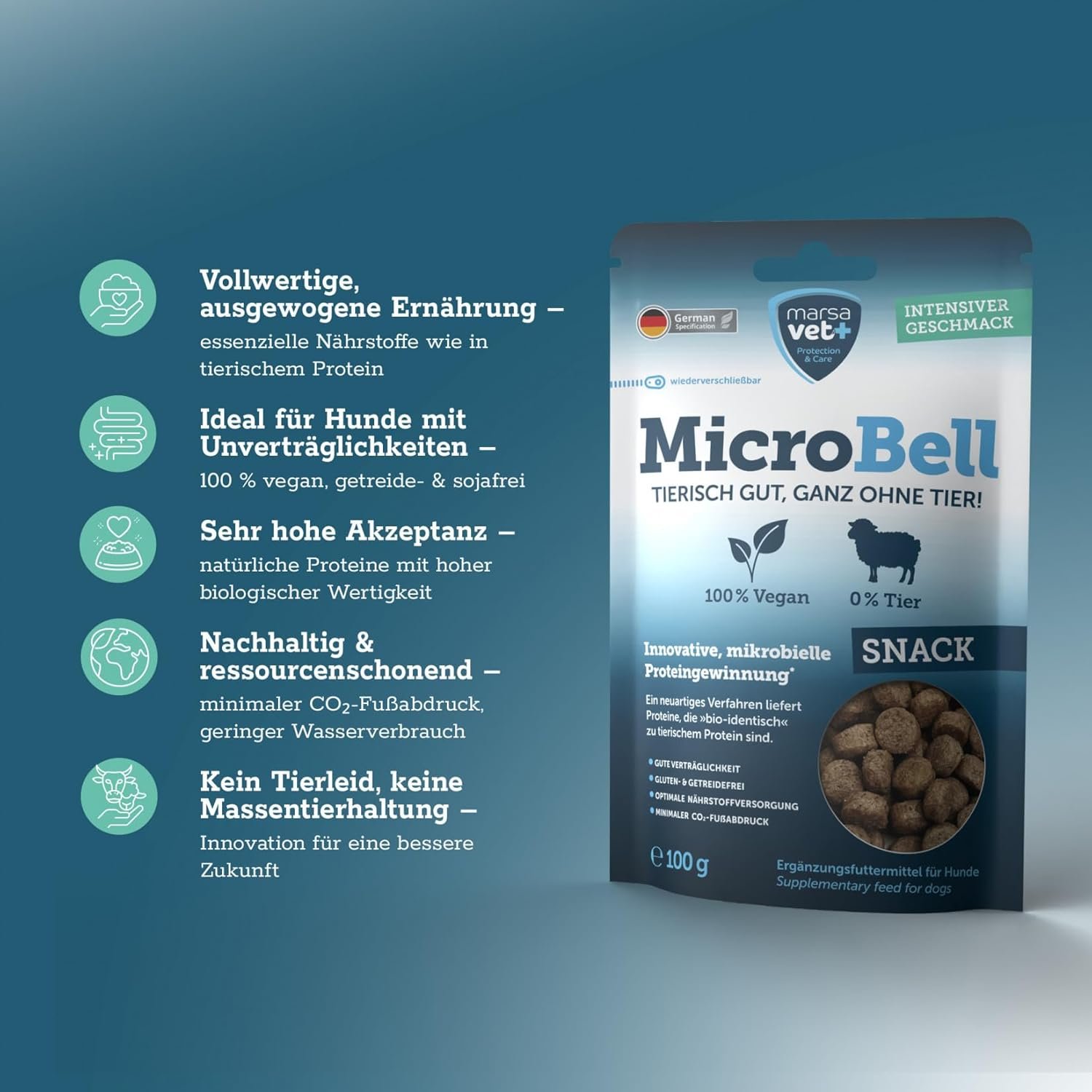 INNOVATIVE VEGANE HUNDE-LECKEREIEN Mit dem Marsavet MicroBell Snack bieten wir die nächste Generation von Hundesnacks. 100 % vegan, fleischfrei, gluten- und getreidefrei – eine bewusste Entscheidung für Hundebesitzer, die Wert auf gesunde und nachhaltige Ernährung legen.