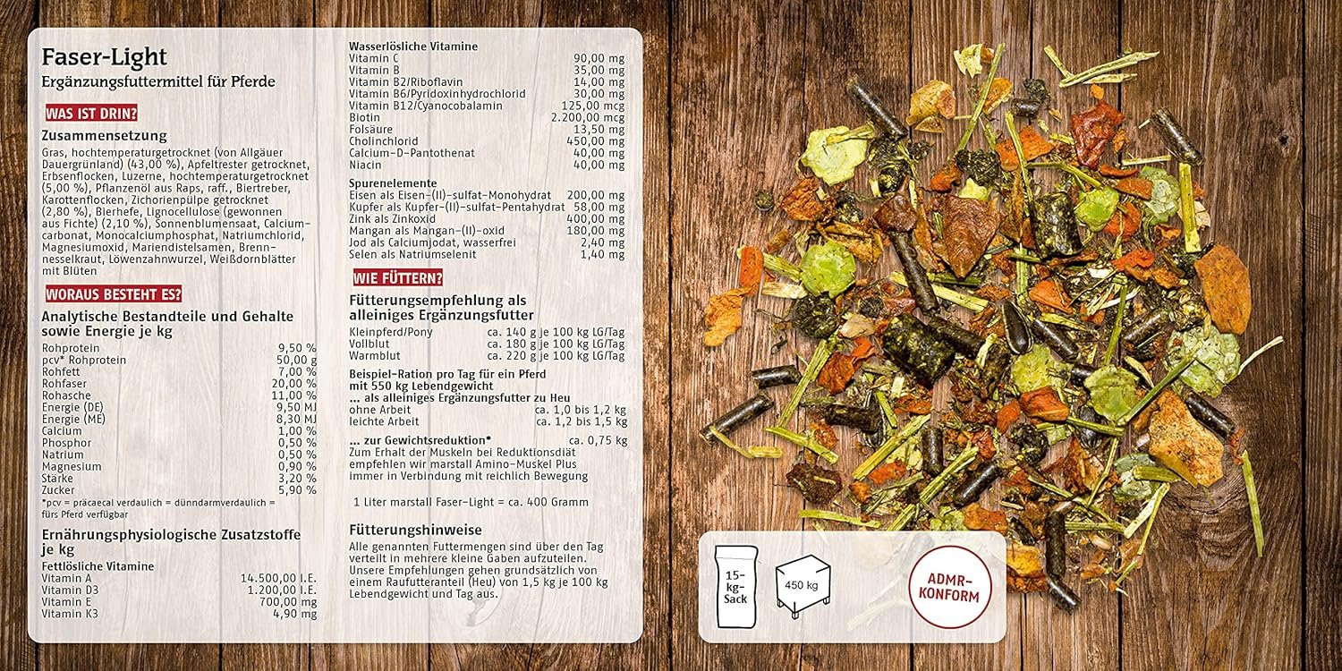 Unser Marstall Fiber Light ist reich an hochwertigen Fasern und Heuhäckslern aus Allgäuer Wiesen. Dies ist wichtig für die Befriedigung des Kaubedürfnisses der Pferde und führt zu einer erhöhten Speichelbildung, um den Säuregehalt im Magen-Darm-Trakt zu puffern. Dank der speziellen Marstall Previta-Faser wirkt das Strukturfutter präbiotisch. Bei der Verdauung der verschiedenen Ballaststofffraktionen durch Mikroben im Dickdarm entstehen für das Pferd wertvolle Darm- und Stoffwechselnährstoffe: flüchtige Fettsäuren. Diese pflegen die Darmzellen und versorgen das Pferd mit Energie, ohne das Blutzucker- und Insulinsystem zu belasten.