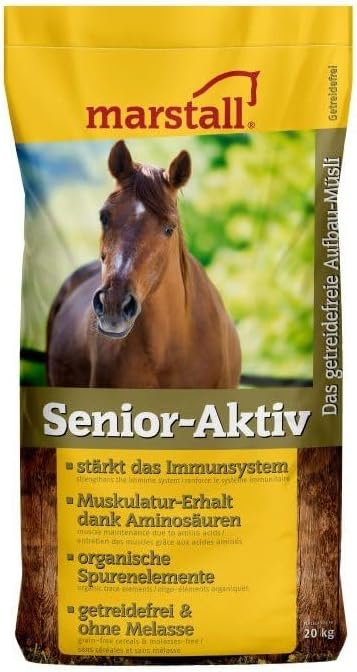 marstall Senior-Aktiv ist ein getreidefreies, leicht verdauliches Getreide, das speziell auf die Bedürfnisse alter Pferde abgestimmt ist. Es fördert den Erhalt und Wiederaufbau der Körpersubstanz. Gleichzeitig unterstützt es die träge Verdauung und das Immunsystem. Senior-Aktiv deckt den teilweise erhöhten Bedarf an Vitaminen und Mineralstoffen bei älteren Pferden und regt die Kautätigkeit an. Das kommt sowohl dem Magen als auch der Psyche zugute. Die bewusst stärke- und zuckerreduzierte Rezeptur ist auch ideal für stoffwechselempfindliche Pferde. Senior-Aktiv ist ein getreidefreies Aufbaugetreide, das gezielt den Erhalt der Muskulatur unterstützt. Eines der wichtigen Ziele bei alten Pferden ist der Erhalt der Muskel- und Körpersubstanz – insbesondere im Fellwechsel und in der kalten Jahreszeit. Senior-Aktiv versorgt sie gezielt mit Energie und essentiellen, leicht verdaulichen Aminosäuren, die der Körper des Pferdes zu 100 % verwerten kann. Bei älteren Pferden ist es außerdem wichtig, die Darmflora und Darmtätigkeit zu unterstützen. Denn nur so gelangen wertvolle Inhaltsstoffe aus der Nahrung in den Körper. Zu diesem Zweck enthält marstall Senior-Aktiv traditionell verwendete Leinsamen sowie Mannan-Oligosaccharide und ß-Glucane (kurz MOS). Studien zufolge bilden diese Bestandteile der Bierhefe-Zellwände einen intakten Biofilm auf der Darmschleimhaut, der als Schutzbarriere für Schadstoffe dient. Gleichzeitig binden MOS Mykotoxine und pathogene Keime im Darm, sodass diese ausgeschieden werden können. Darüber hinaus sind MOS Nahrung für die guten Darmbakterien (präbiotische Wirkung). Zusammen entlasten diese Eigenschaften das Immunsystem.