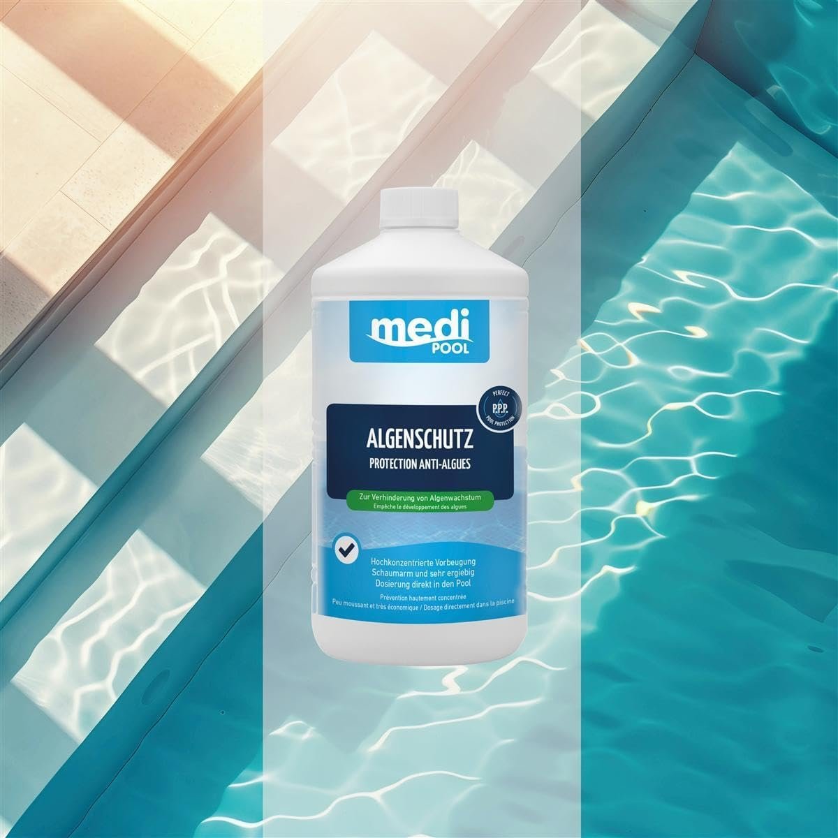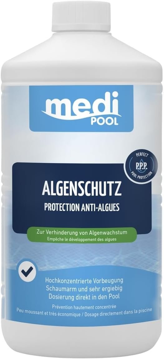 Zur Vorbeugung und Bekämpfung von Algen ist der Einsatz eines wirksamen Algenmittels unerlässlich. Trübungen und klares Wasser vermeiden – das gelingt mit einem guten Algenschutz. Ein Algenschutzmittel von mediPOOL erledigt diese Aufgabe mühelos.
