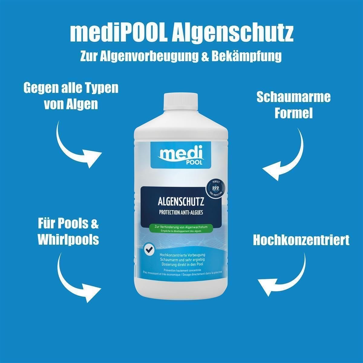 Perfekter Algenschutz für den Pool. Einfache Anwendung. Bewährte Qualität. Zur Algenvorbeugung und -bekämpfung