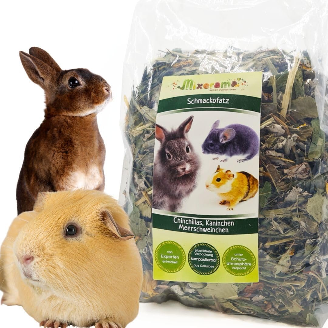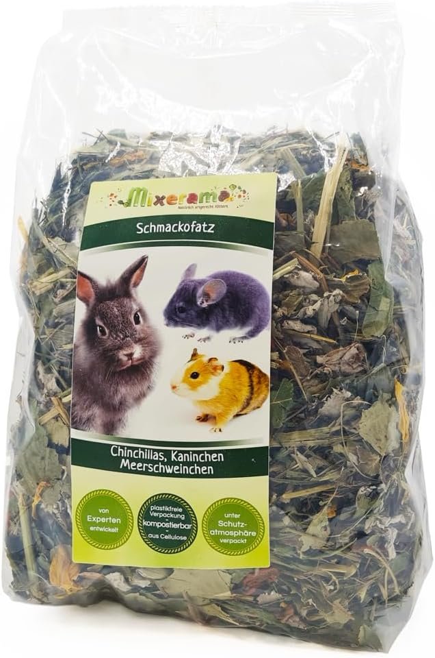 Schmackofatz ist eine abwechslungsreiche Mischung aus Gras und Blättern mit Gemüse für Kaninchen, Meerschweinchen und Chinchillas. Grundlage der Mischung ist ein natürliches Bio-Wiesengras, dessen Bestandteile eine verdauungsfördernde Wirkung haben sollen. Das Bio-Rissgras enthält zum Beispiel Wiesenfuchsschwanz, Ringelgras, Wiesenschwingel, Rotschwingel, Weiches Honiggras, Wiesenrispe, Rauchgras, Gebirgsgras, Bärenwurz, Weißklee, Rotklee, Stärkekraut, Wiesenglockenblume, Wiesenmargerite, Kriechender Hahnenfuß, Löwenzahn, Gänsefingerkraut, Camper, Schlangenknöterich, Frauenmantel, Gebirgsliebe (Arnika), Bettkraut, Glatthafer, diverse Seggen und Binsen, Wiesenbärenklaue, kleiner Rasseltopf, Wiesenblatterbse, Johanniskraut, Wiesenerbse und viele mehr. Fettarmes Gemüse wie Karotten, Spinat, Tomaten und Paprika runden den Geschmack ab. Die Mischung für Kanin und große Nagetiere. Schmackofatz kann das Frischfutter täglich ergänzen.