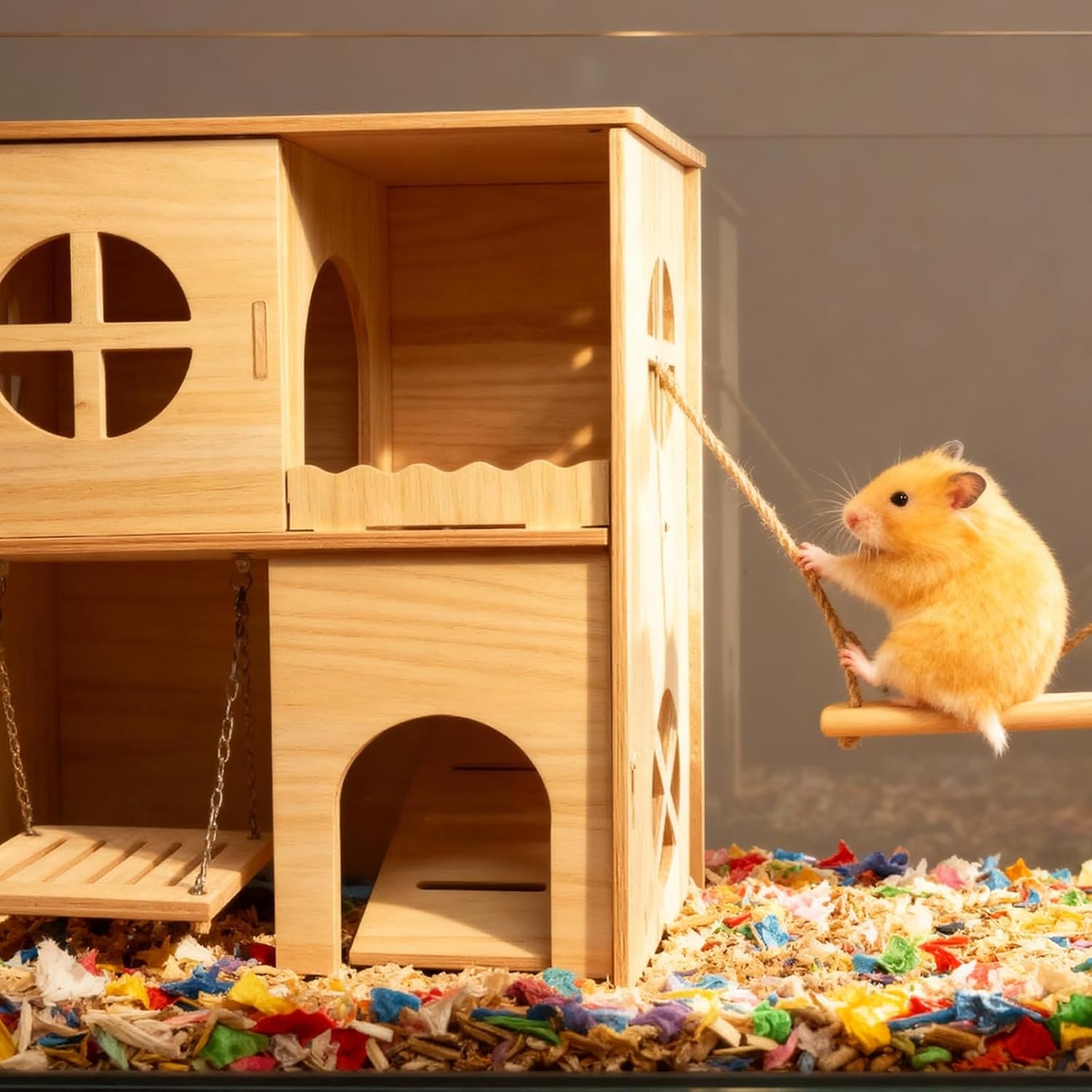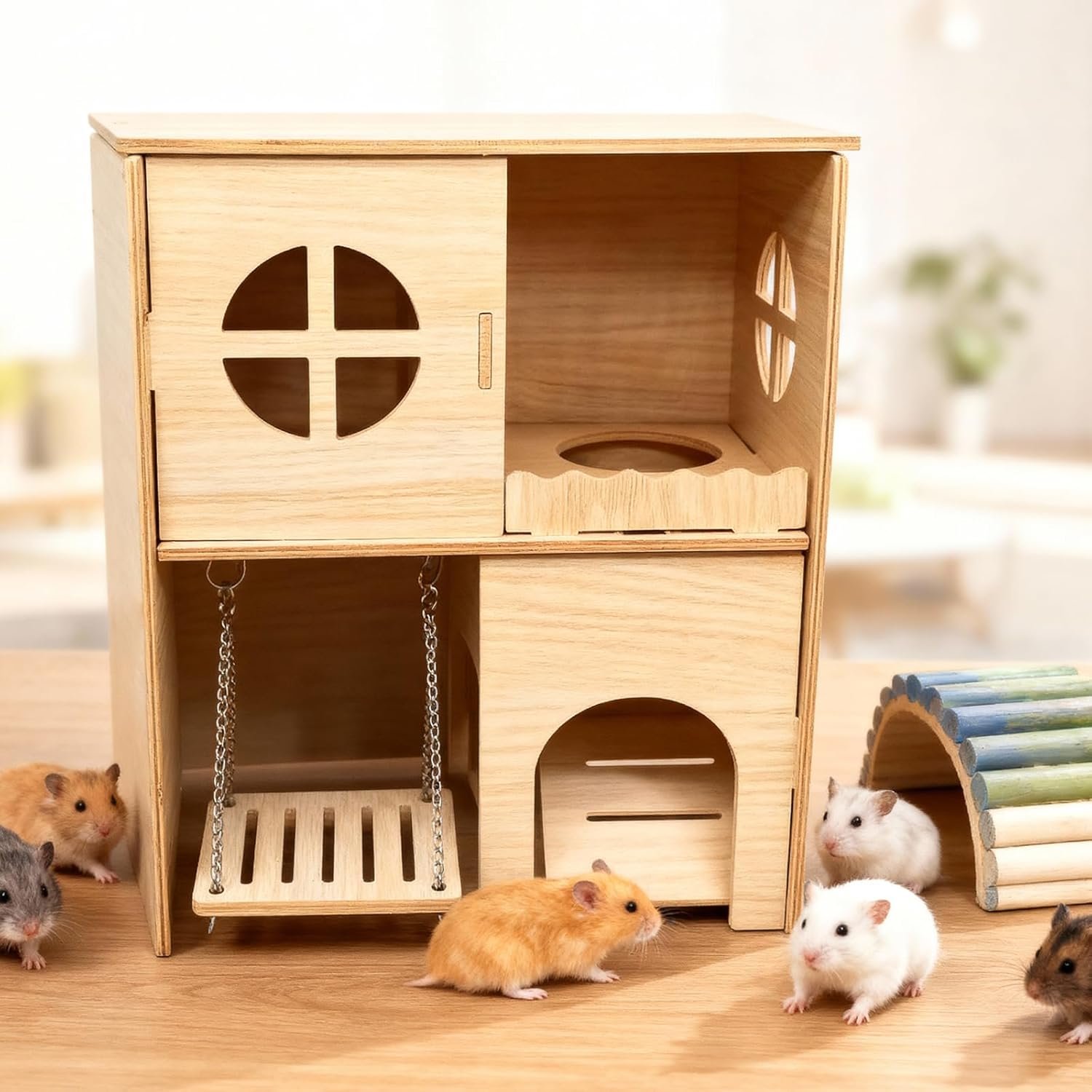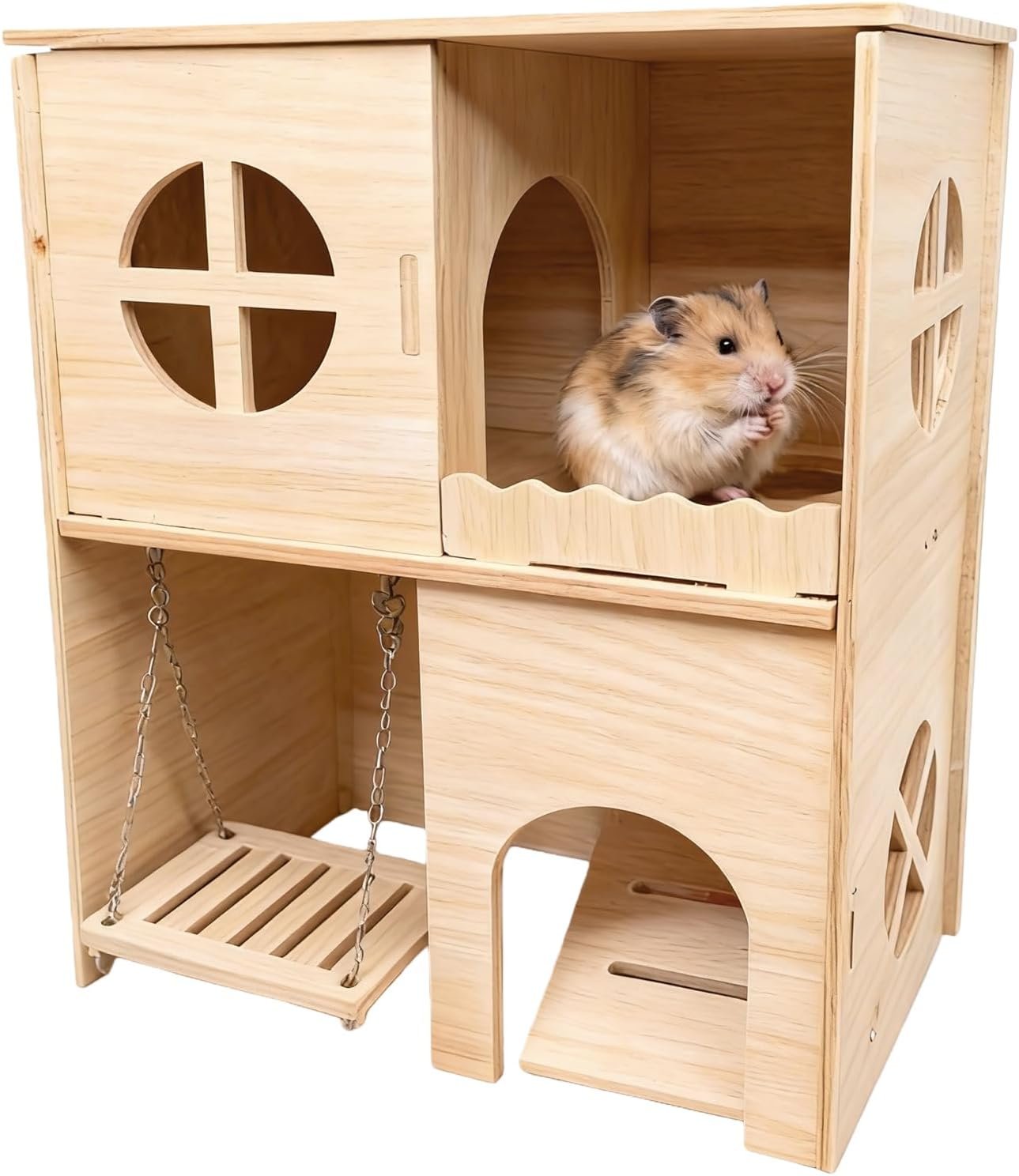 [Thoughtful Design] Dieses Meerschweinchenhaus aus Holz verfügt über eine innovative Schaukel und eine rutschfeste Rampe, die Ihrem kleinen Haustier einen sicheren Ein- und Ausstieg sowie Zugang zu Futter und Spielzeug ermöglicht. Dieses Hamsterhaus fördert die aktive Erkundung, beugt Langeweile vor, verbessert die Lebensqualität und erfüllt das natürliche Bewegungsbedürfnis Ihres Hamsters.