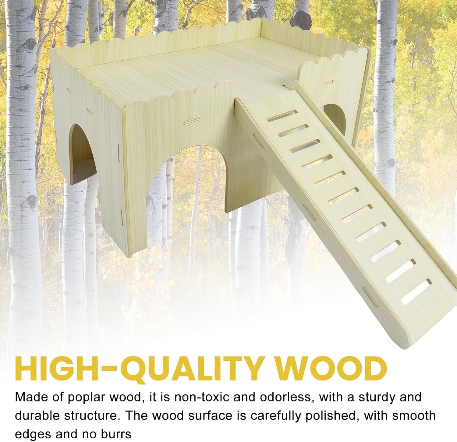 Hochwertiges Holz: Großes Meerschweinchenhaus besteht aus Pappelholz, das ungiftig und geruchlos ist, mit einer robusten und langlebigen Struktur, und die Holzoberfläche des Meerschweinchenspielzeugs ist sorgfältig poliert, mit abgerundeten Kanten und ohne Grate, sodass Sie sich keine Sorgen machen müssen, Ihr Meerschweinchen zu zerkratzen, was die Sicherheit Ihres Haustieres gewährleistet. Die Oberfläche ist wasserdicht und leicht zu reinigen.