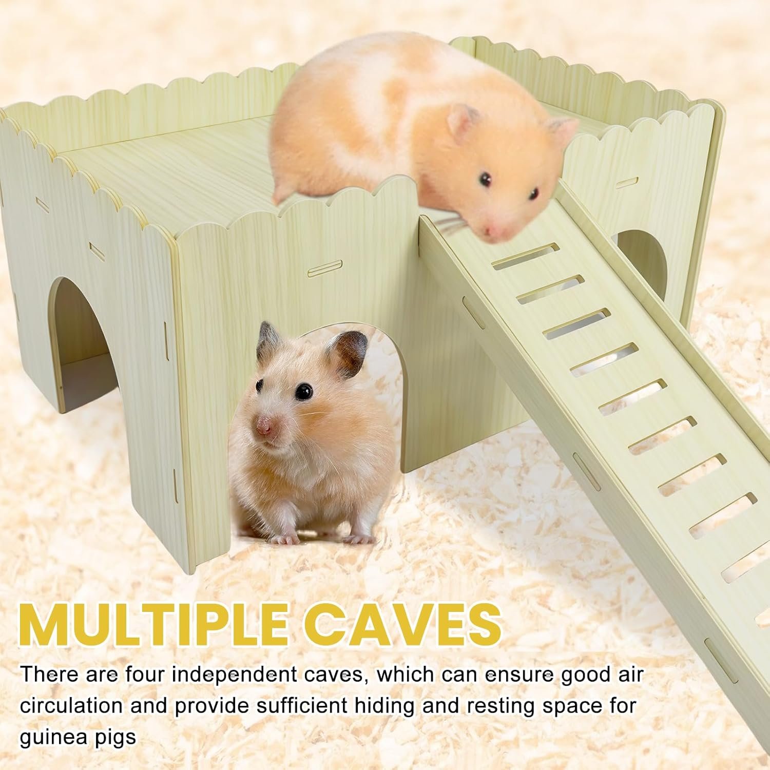 Mehrere Höhlen: Meerschweinchen-Versteck aus Holz ist mit 4 unabhängigen Höhlen ausgestattet, die für eine gute Luftzirkulation sorgen und den Meerschweinchen ausreichend Versteck- und Ruhemöglichkeiten bieten. Dank der mitgelieferten abnehmbaren Leiter können sich Meerschweinchen frei zwischen den verschiedenen Ebenen bewegen, was ihre Entdeckungslust anregt und den Spaß an der Aktivität erhöht