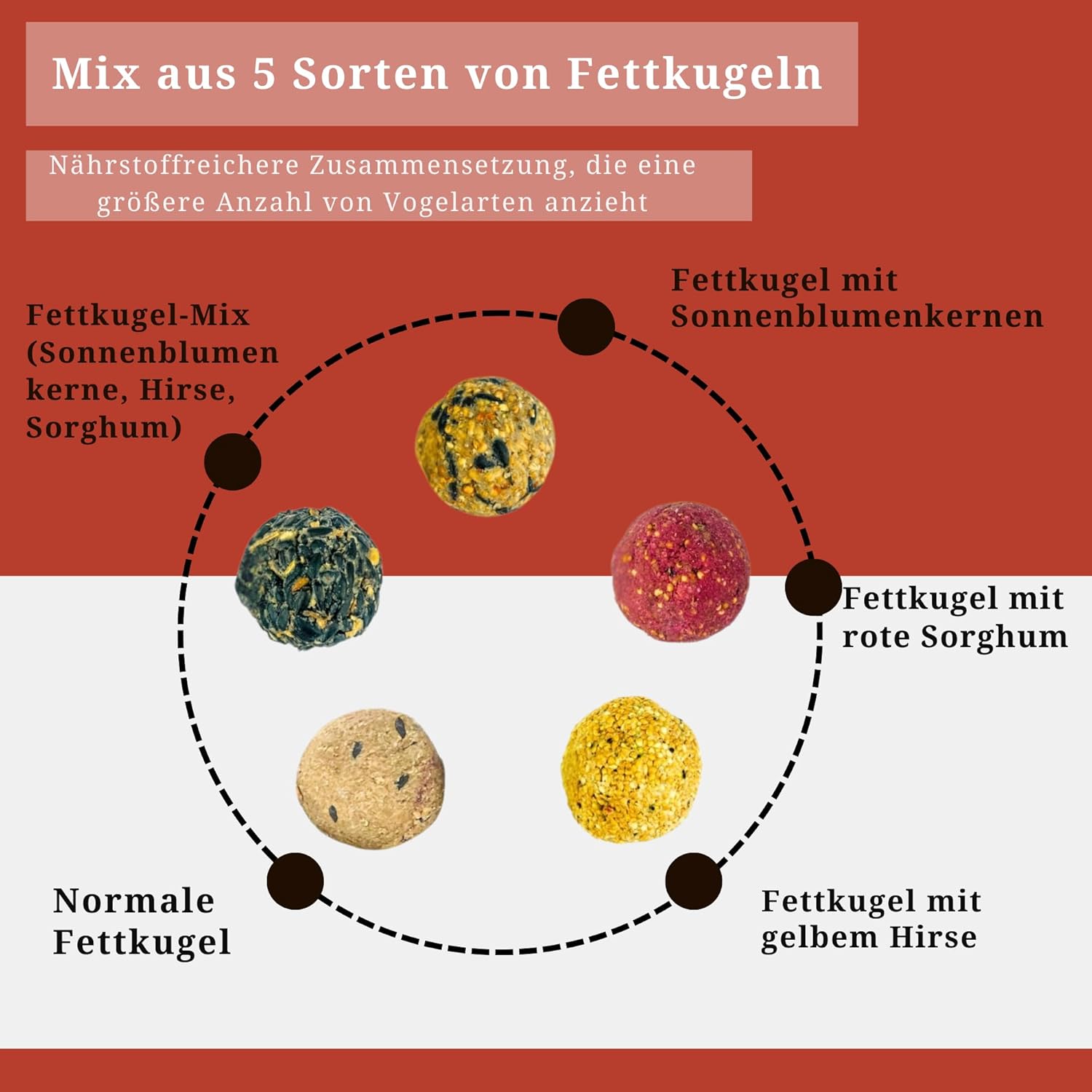 Dank der Vielfalt an unterschiedlichen Zutaten locken unsere Fettknödel außergewöhnlich viele Wildvögel an und verwandeln Ihren Garten in ein wahres Paradies für gefiederte Gäste. Das Futter enthält Sonnenblumenkerne, Samen anderer Ölpflanzen, Getreidemehl, Nüsse, tierische Fette sowie Futterkalk, gelbe Hirse und rotes Sorghum, die für den biologischen Kreislauf der Vögel unerlässlich sind.