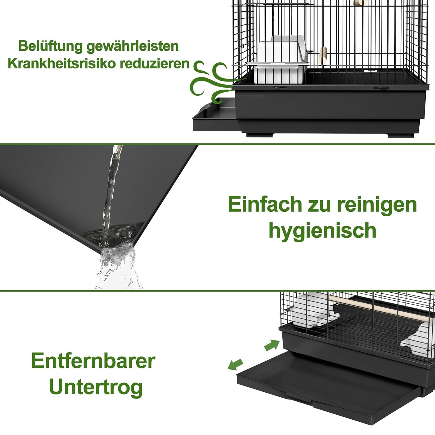 Reinigung im Handumdrehen: Dank des abnehmbaren Kunststoffbodens mit Auffangschale lässt sich der Exotenkäfig besonders leicht reinigen. Ziehen Sie einfach die Basis heraus, reinigen Sie sie und setzen Sie sie wieder ein – so bleibt das Zuhause Ihrer Vögel ohne großen Aufwand hygienisch und sauber. Ideal für alle, die wenig Zeit für die Käfigpflege haben