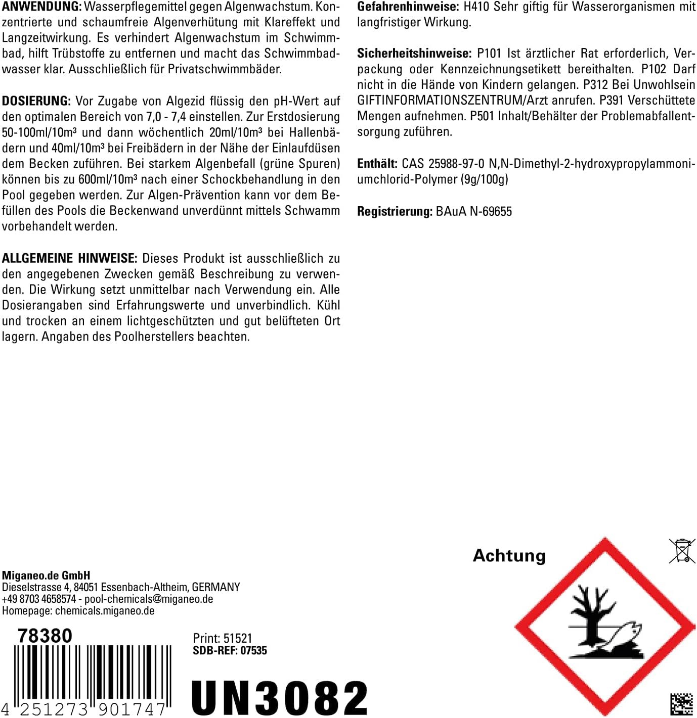 Hochkonzentrierte und schaumfreie Algenprävention mit deutlicher Wirkung. Hochkonzentriertes und schaumfreies, flüssiges Algenbekämpfungsmittel mit Langzeitwirkung zur Vorbeugung und Abtötung vorhandener Algen. Alzoid verhindert Algenwachstum im Schwimmbad, hilft bei der Entfernung von Trübstoffen und macht das Schwimmbadwasser klar.