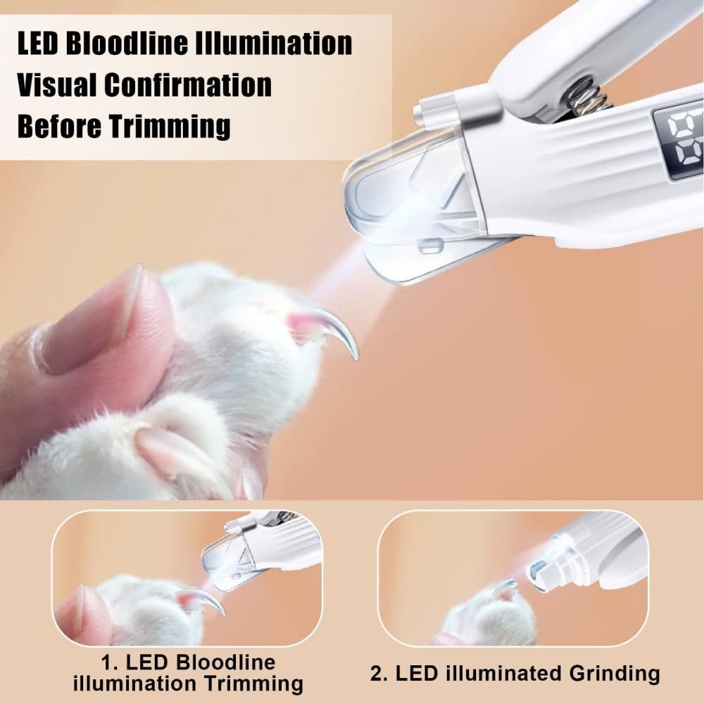 2. 【Eingebaute Nagellackfunktion】 Das eingebaute Design ist mit einem multifunktionalen Nagelschleifkopf ausgestattet, der Grobschliff und Feinpolieren unterstützt. Es ist für unterschiedliche Nagelstärken geeignet, von kleinen Haustieren wie Chihuahuas bis hin zu großen Haustieren wie Golden Retrievern und Huskys. Die Kante kann sofort nach dem Schneiden poliert werden.