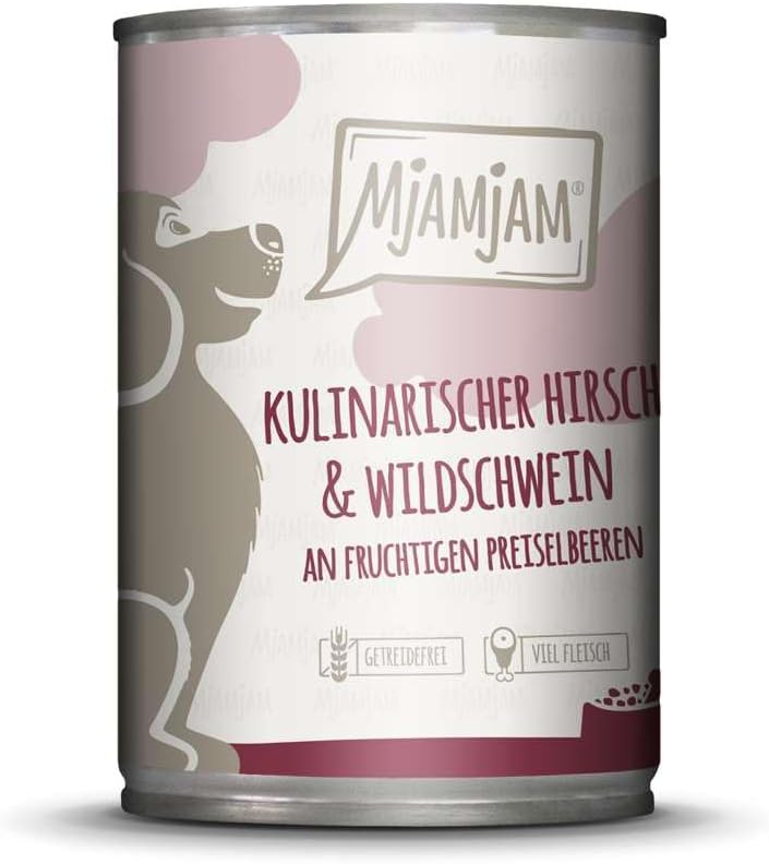 Zutaten: Wildfleisch (Hirsch 50 %, Wildschwein 50 %) (45,4 %), Fleischbrühe (30,1 %), Schweinefleisch (Herz, Leber) (21,5 %), Preiselbeeren (2 %), Mineralstoffe (0,5 %), Eierschalen (0,5 %).