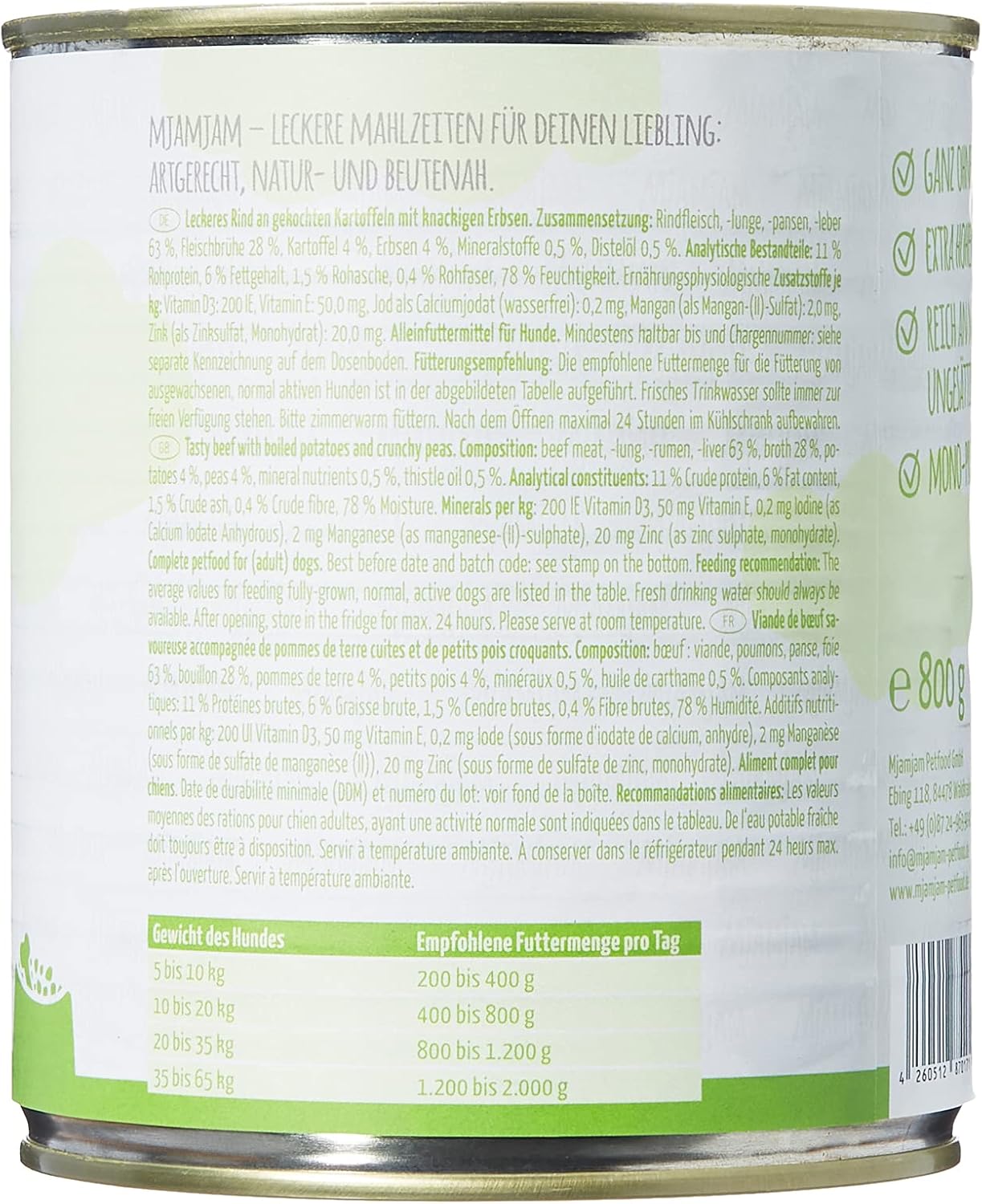 Zutaten: Rindfleisch, Lunge, Pansen, Leber (63 %), Fleischbrühe (28 %), Kartoffel (4 %), Erbsen (4 %), Mineralstoffe (0,5 %), Distelöl (0,5 %).