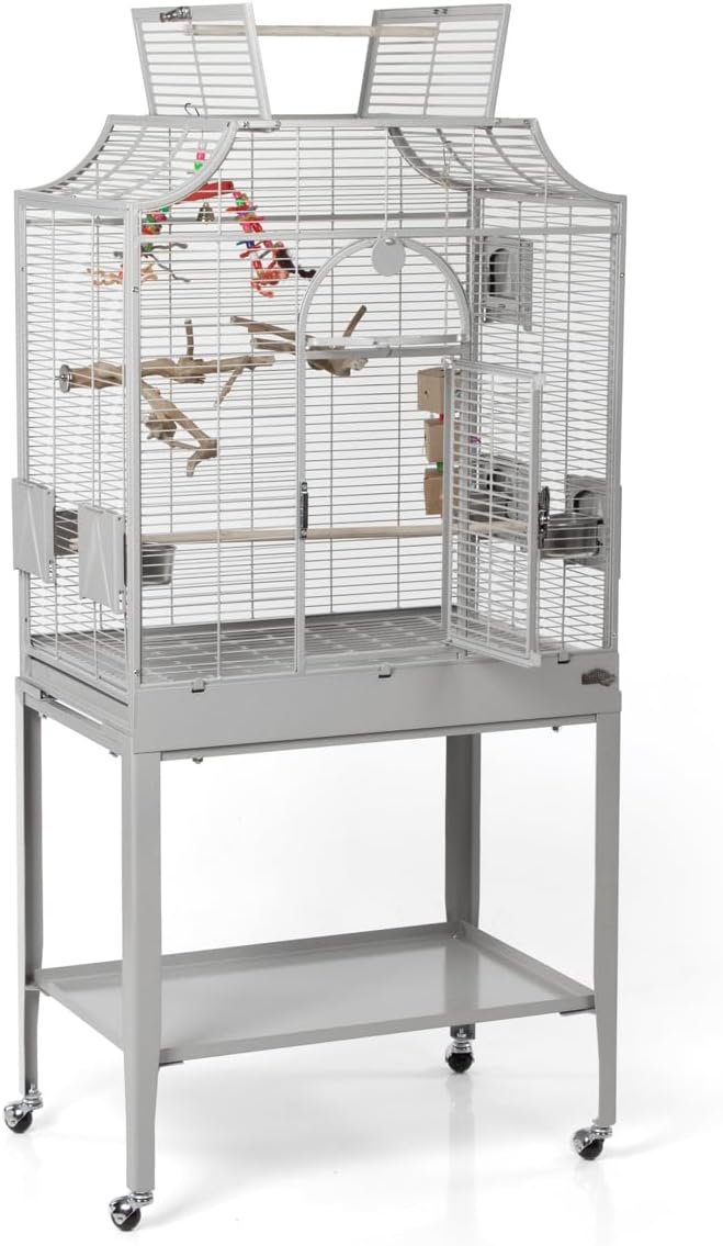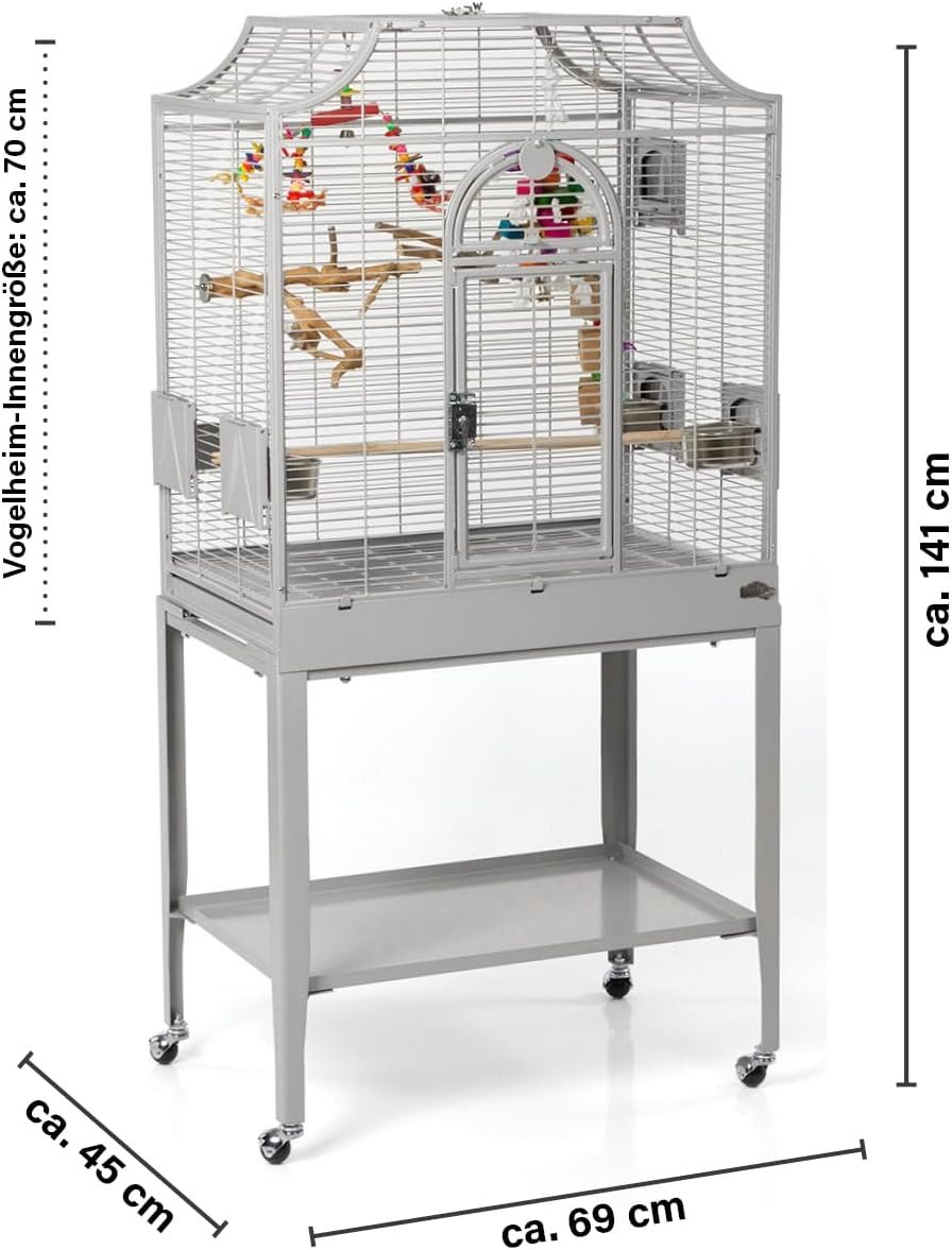 Lieferumfang: Vogelkäfig Madeira I in Platin, Aufbauanleitung, 4 Edelstahlnäpfe und einfache Sitzstangen aus Holz als Erstausstattung. Der Vogelkäfig wird ohne die abgebildeten Vogelspielzeuge geliefert, diese können optional bei uns erworben werden