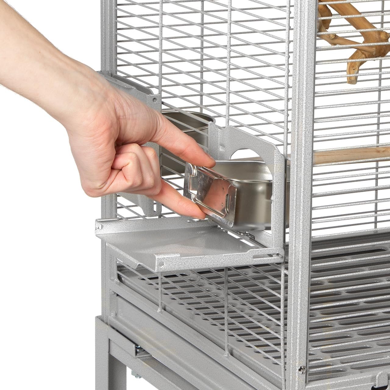 Der Vogelkäfig besteht aus zink- und schwermetallfreiem Stahl und einer filigranen horizontalen Verkabelung. Die Käfigoberfläche ist mit unserer bewährten und patentierten Avilon-Pulverbeschichtung ausgestattet, die für Vögel unbedenklich ist. Dadurch bleibt der Käfig rost- und alterungsbeständig