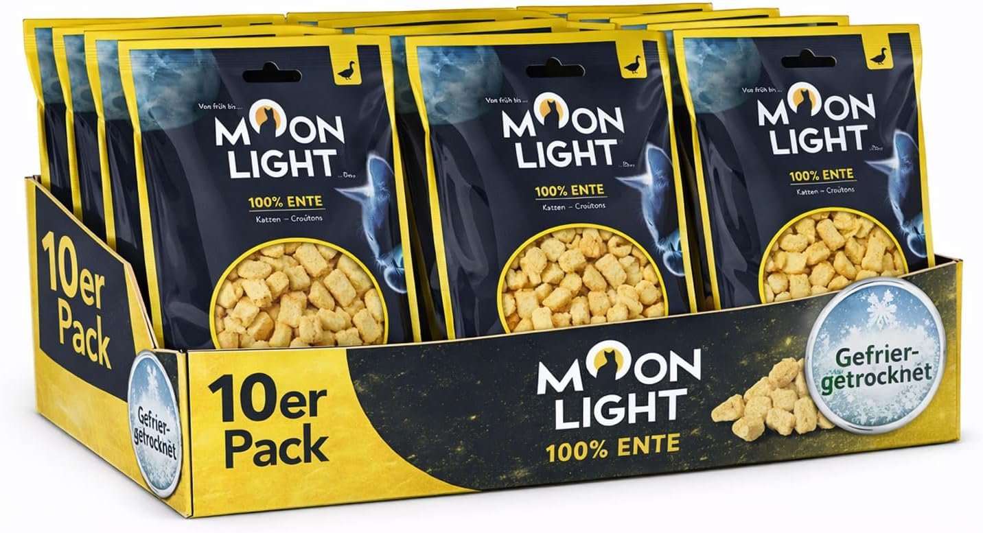 Moonlight Cat Croûtons – Feine Snacks für echte Feinschmecker Die Moonlight Cat Croûtons sind gefriergetrocknete, knusprige Snacks für anspruchsvolle Katzen. Aus hochwertigen Zutaten hergestellt und schonend verarbeitet, bieten sie puren Geschmack und eine besonders hohe Akzeptanz. Die feinen Croûtons bestehen je nach Sorte zu 100 % aus Fleisch oder Fisch oder aus einer ausgewogenen Mehrkomponenten-Rezeptur und überzeugen durch ihre natürliche Textur und ihr intensives Aroma. Durch die Gefriertrocknung bleiben Geschmack, Struktur und Charakter der einzelnen Zutaten erhalten. Die Croûtons sind leicht, knusprig und lassen sich perfekt portionieren – perfekt als Belohnung zwischendurch oder als hochwertiges Topping auf Nass- oder Trockenfutter. Jede Sorte spricht unterschiedliche Vorlieben an: von mildem Hähnchenfleisch über aromatische Hühnerleber bis hin zu intensiven Fischsorten wie Lachs oder Thunfisch. Auch geschmacklich bietet die Sorte Hühner- und Katzengras Abwechslung durch eine fein abgestimmte Kombination aus Fleisch, Fisch, Innereien und Katzengras. Die Katzencroûtons von Moonlight richten sich an Katzenbesitzer, die Wert auf Qualität, Abwechslung und Genuss legen – sowie an Besitzer wählerischer, sensibler oder schnell gelangweilter Katzen. Dank der klaren Deklaration und dem Verzicht auf Getreide und Zucker eignen sich die Croûtons zur bewussten, reduzierten Fütterung und lassen sich flexibel in den Alltag integrieren. Der praktische Beutel mit Reißverschluss ermöglicht ein einfaches Wiederverschließen und unterstützt die Erhaltung der Frische und Knusprigkeit nach dem Öffnen. Moonlight Cat Croûtons – knusprig, rein und voller Geschmack. Für Katzen, die wissen, was sie wollen.