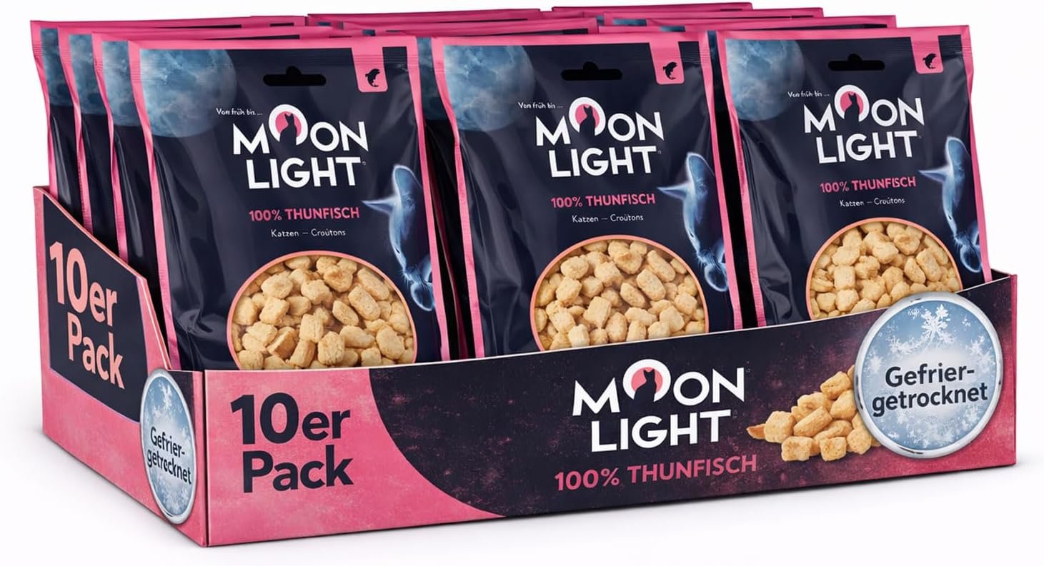 Entdecken Sie den unwiderstehlichen Katzensnack Moonlight – 100 % gefriergetrockneter Thunfisch, ideal für empfindliche Katzen und Allergiker. Hergestellt aus hochwertigem Thunfisch bietet dieser natürliche Katzensnack mit Monoprotein einen gesunden und leckeren Leckerbissen für Ihre Samtpfote. Ohne künstliche Zusatzstoffe, Konservierungsstoffe oder Geschmacksverstärker sorgt Moonlight für ein natürliches Geschmackserlebnis. Wählen Sie zwischen einer Einzelpackung oder dem Vorteilspack mit 10 Stück und verwöhnen Sie Ihre Katze mit diesem leckeren Snack.