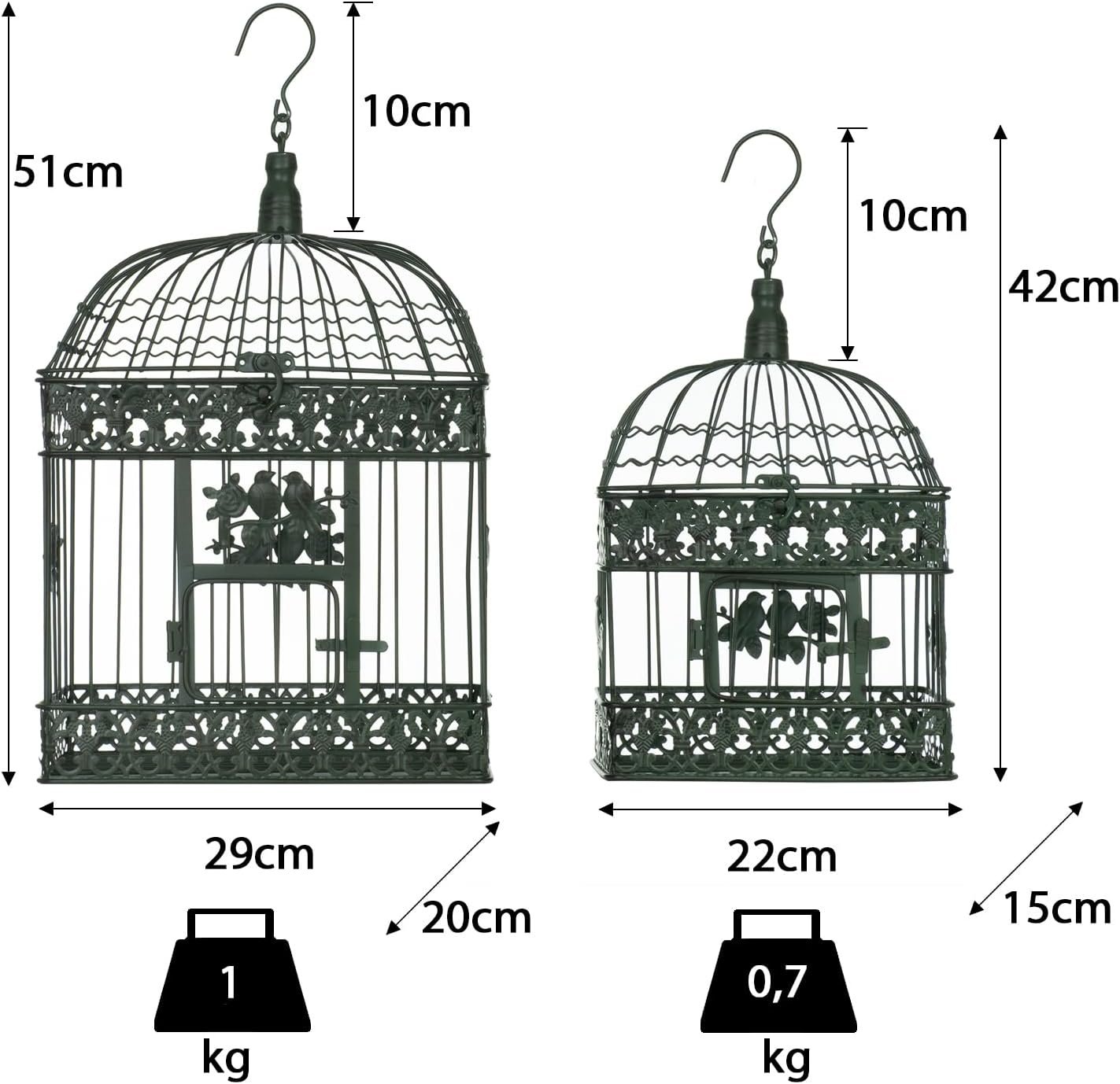 Dieses dekorative Käfigset im Vintage-Stil verleiht jedem Raum oder Garten eine romantische Note. Die liebevoll gestalteten Metallkäfige in Altgrün sind mit filigranen Ornamenten und Blumenmotiven verziert. Sie eignen sich hervorragend für Hängedekorationen, Kerzenhalter, Blumendekorationen oder Tischdekorationen für Hochzeiten, Partys oder das Zuhause. Mit Höhen von ca. Mit einer Größe von ca. 51 cm und 42 cm sind sie im Innen- und Außenbereich ein stilvoller Blickfang.
