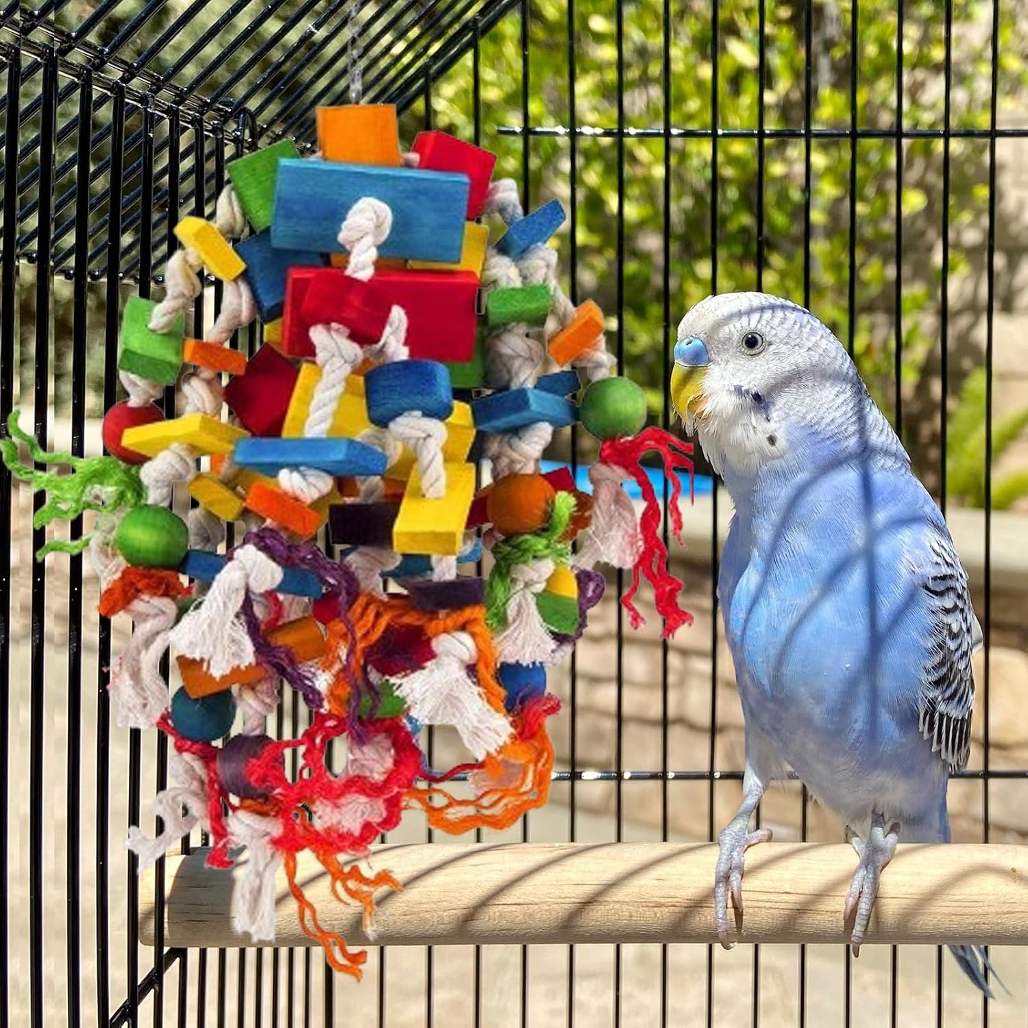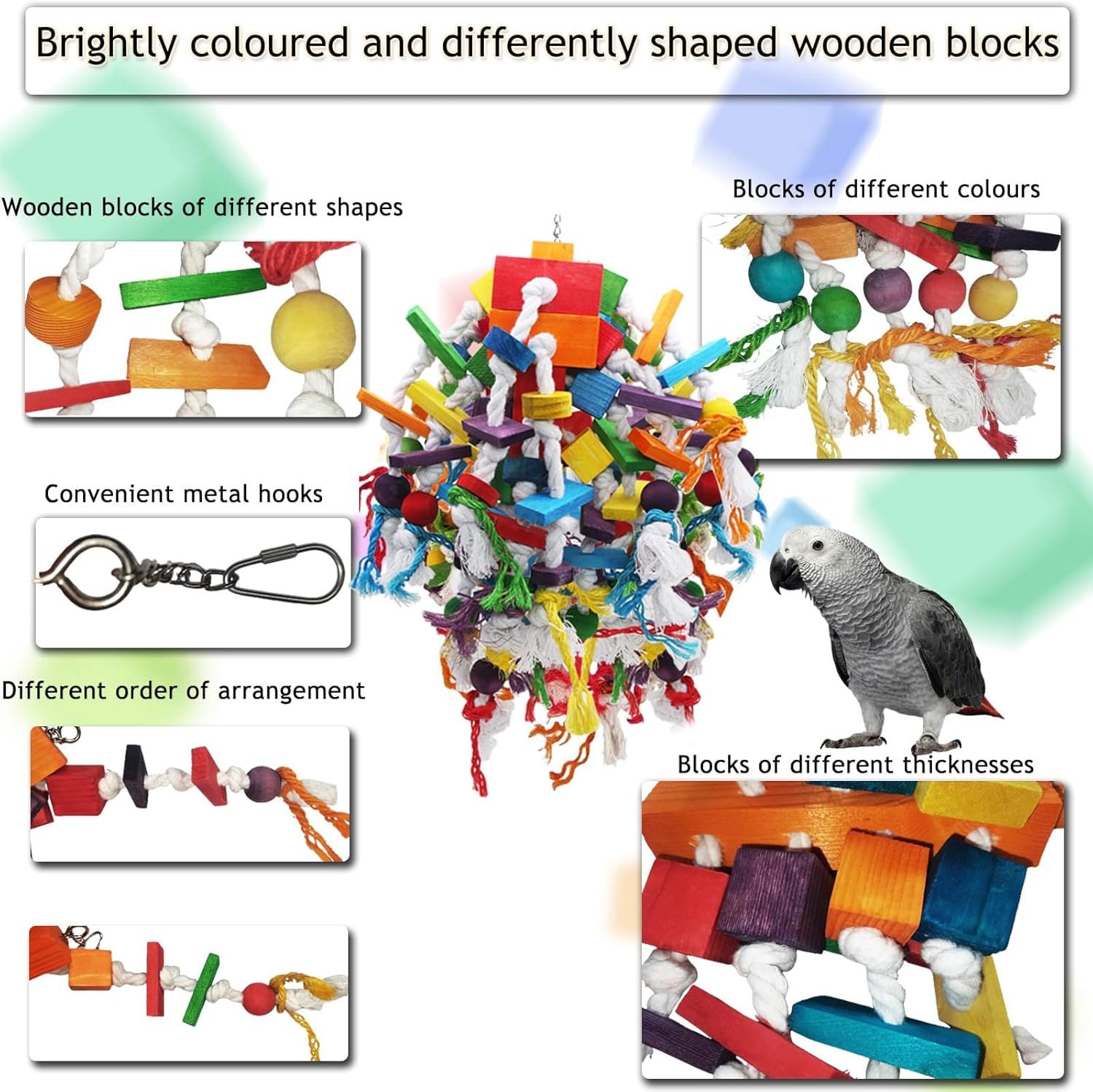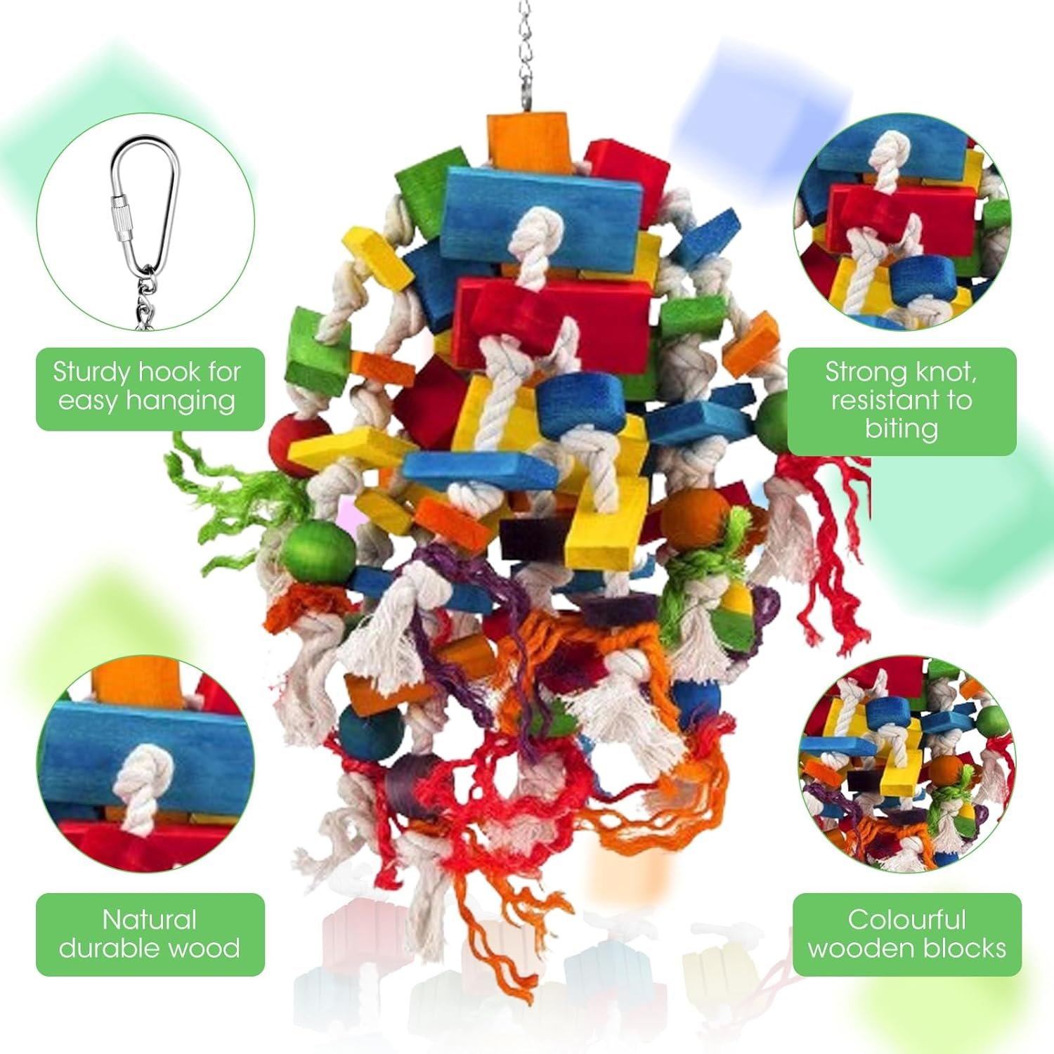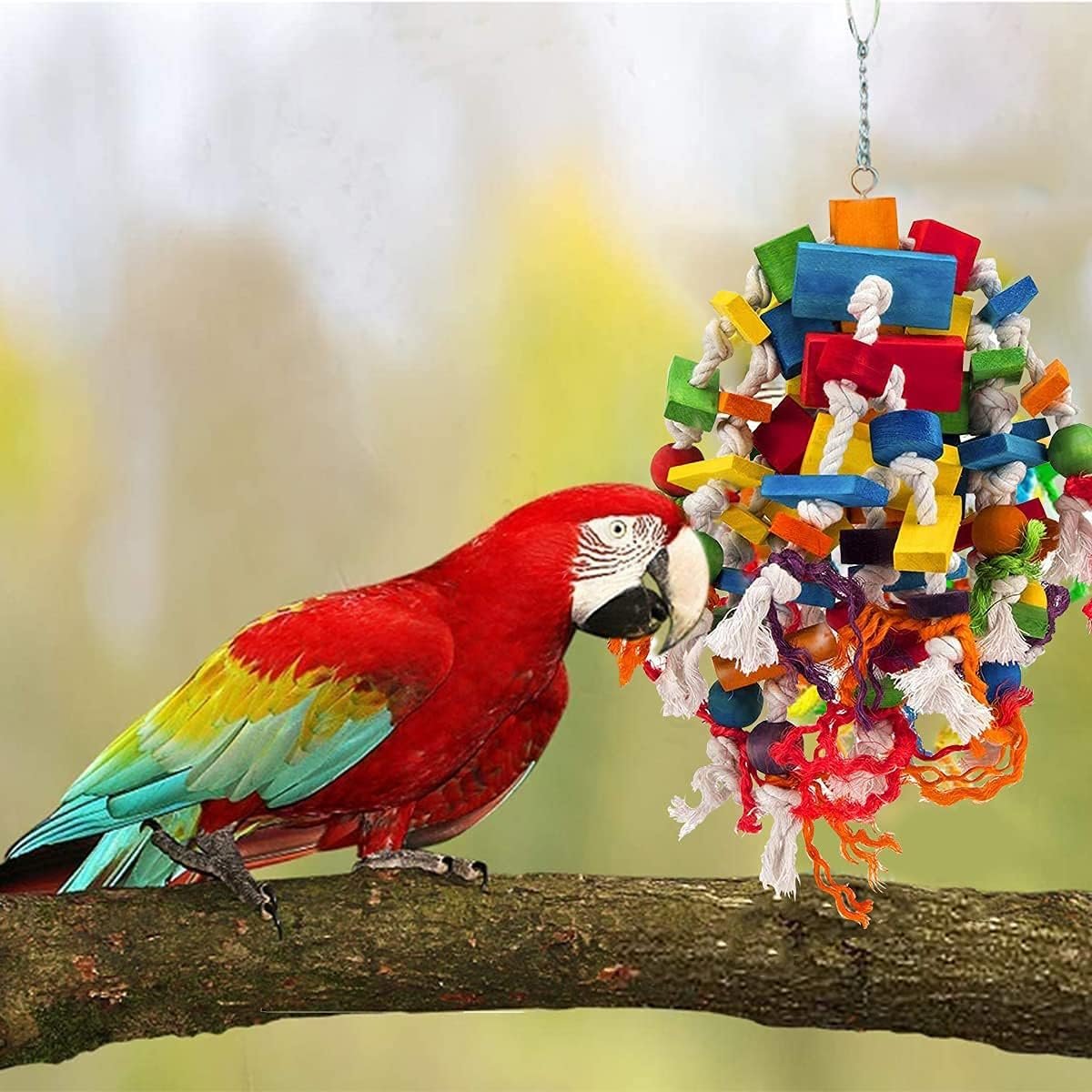 MQUPIN Papageien-Kauspielzeug ist die perfekte Wahl. Es ist ein Kauspielzeug mit vielen markanten farbigen Holzklötzen und Knoten. Vögel lieben es, Baumwollseilknoten zu lösen, um ihren instinktiven Kauinstinkt zu befriedigen. Dieses robuste und langlebige Spielzeug reicht für mittelgroße bis große Vögel.
