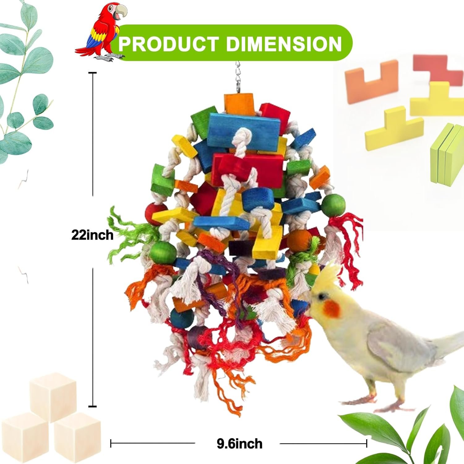 Vogel-Fitnessstudio und Erholungsbereich: Papageienspielzeug kann den Stress Ihres Papageis abbauen und langweilige Zeit vertreiben, wodurch Ihr Vogel lebendiger wird. Die Holzklötze sind langlebig und können lange gekaut werden, um Ihrem geliebten Vogel die Zahnpflege zu bieten, und die farbenfrohen Vogelspielzeuge sind wunderschöne Dekorationen zum Aufhängen im Käfig oder an der Wand zu Hause.