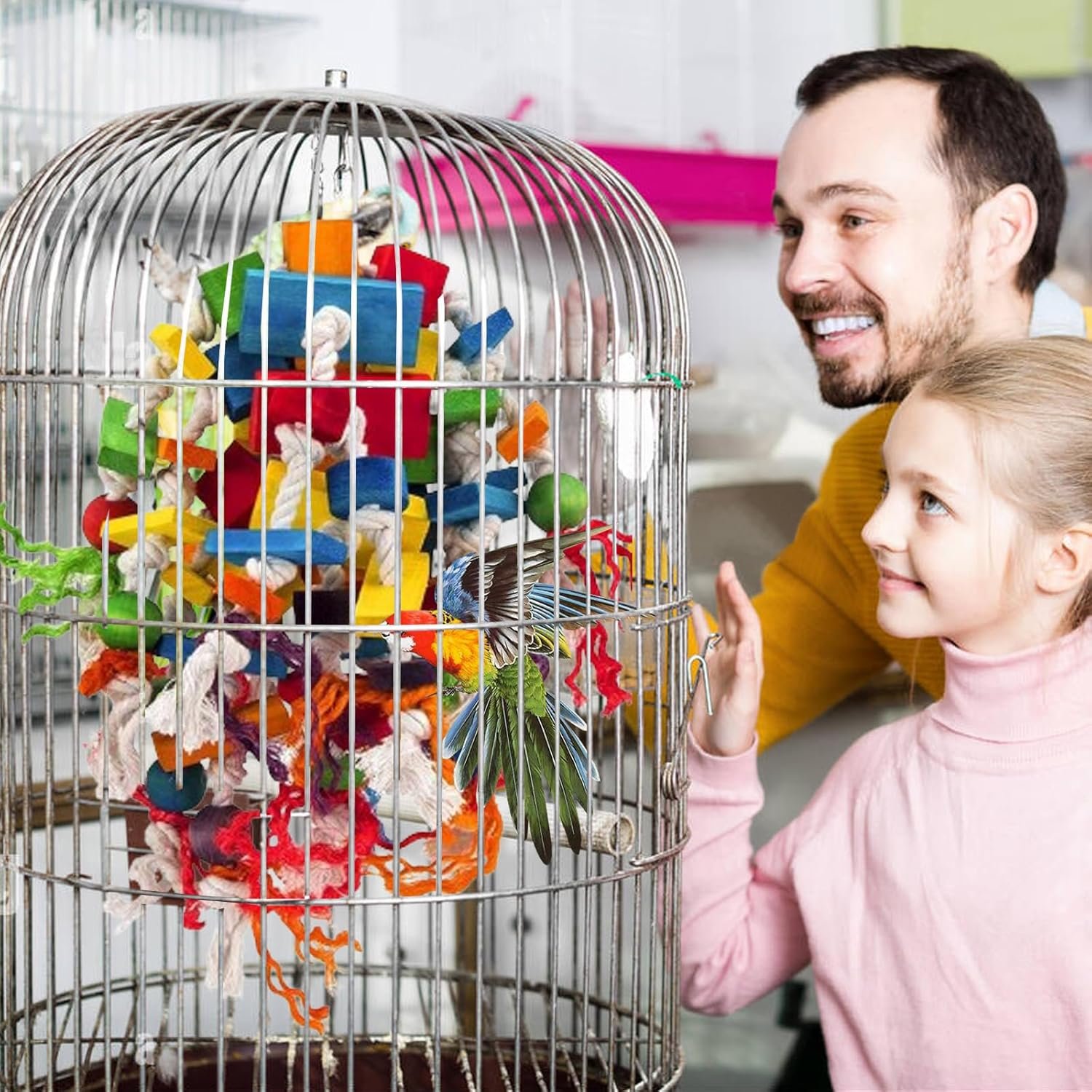 1. Unsere Produkte sind einfach zu installieren und am Vogelkäfig aufzuhängen. Und es ist für die meisten Käfige geeignet. Die Stahlhaken werden einfach am Käfig befestigt, sparen Platz und schmücken den Vogelkäfig. Bieten Sie Heimvögeln Freude und Spaß im Leben. 2. Das Vogelspielzeug besteht aus langlebigen und ungiftigen Sicherheitsmaterialien für Haustiere, und Ihre Haustiervögel können damit ohne Bedenken spielen, um sicherzustellen, dass Ihr Haustier gesund und sicher ist. 3. Buntes und helles Holzspielzeug mit knackigen Glockentönen kann die Aufmerksamkeit von Ziervögeln auf sich ziehen, Ihre Haustiere glücklich machen und Ihrem Leben Vitalität verleihen.