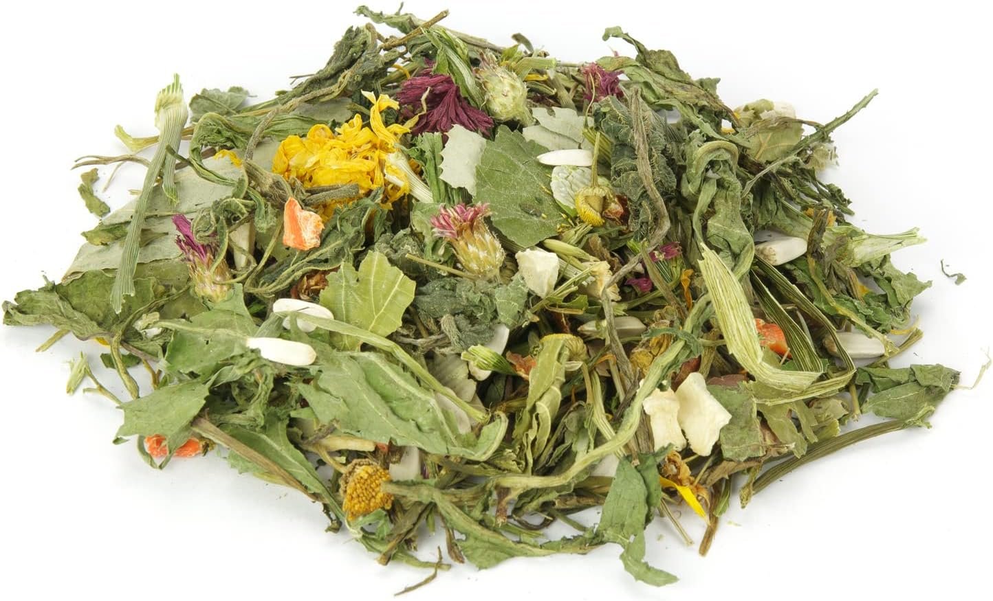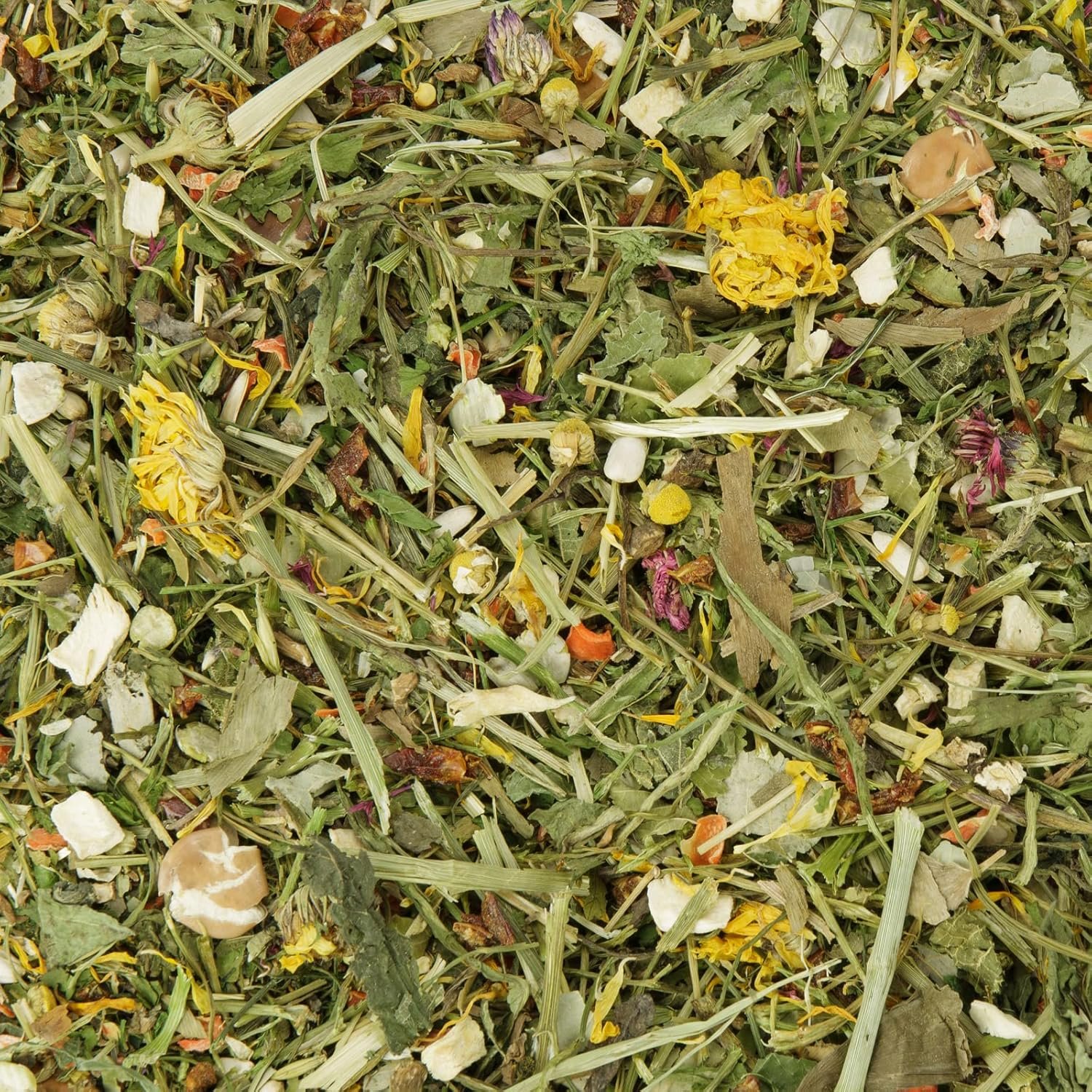 Ergänzungsfuttermittel für Nagetiere – Zusammensetzung: grüner Hafer, Dillstängel, Petersilienstängel, weiße Sonnenblumenkerne, Karottenstücke, Löwenzahnwurzelschnitt, Erbsenflocken, Bohnenflocken, Pastinaken, Brennnessel, Löwenzahn, Paprika (rot), Ringelblume, Pfefferminze, Gingkoblätter, Lindenblätter, Kornblumenblüten rot, Rotklee. Commm.bbbflowers.