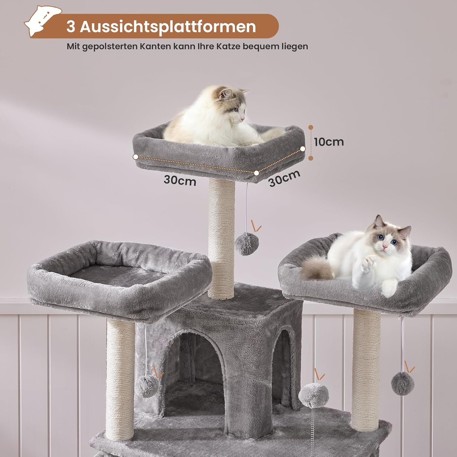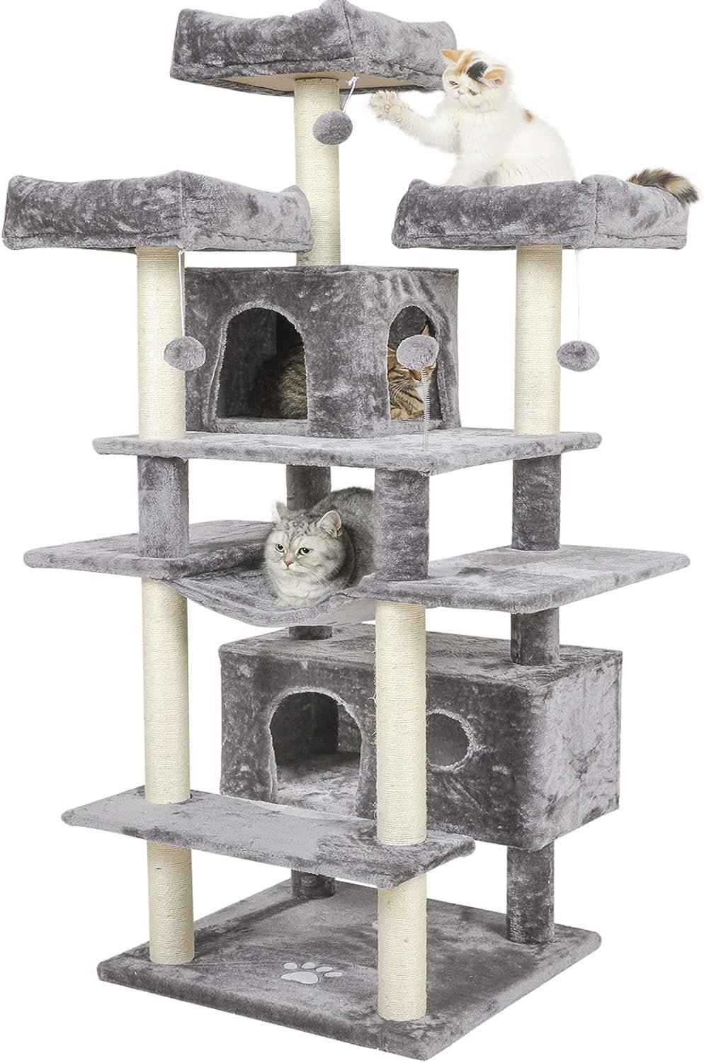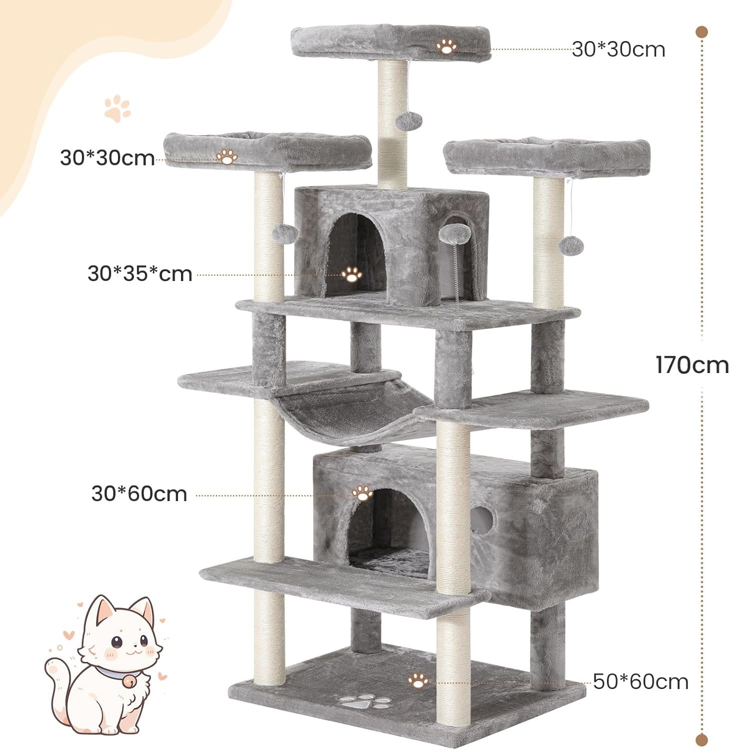 Komfortzone für Ihre Katze mit 2 Höhlen: Zur hervorragenden Ausstattung dieses Kratzbaums gehören 3 Aussichtsplattformen, 2 Höhlen und Plüschbälle mit Glöckchen. Ob gemütlich oder zum Spielen, der Kratzbaum wird von jeder Katzenlaune voll ausgenutzt. 175 cm großer Kratzbaum, ideal für große Katzen, Kätzchen, erwachsene und behinderte Katzen.