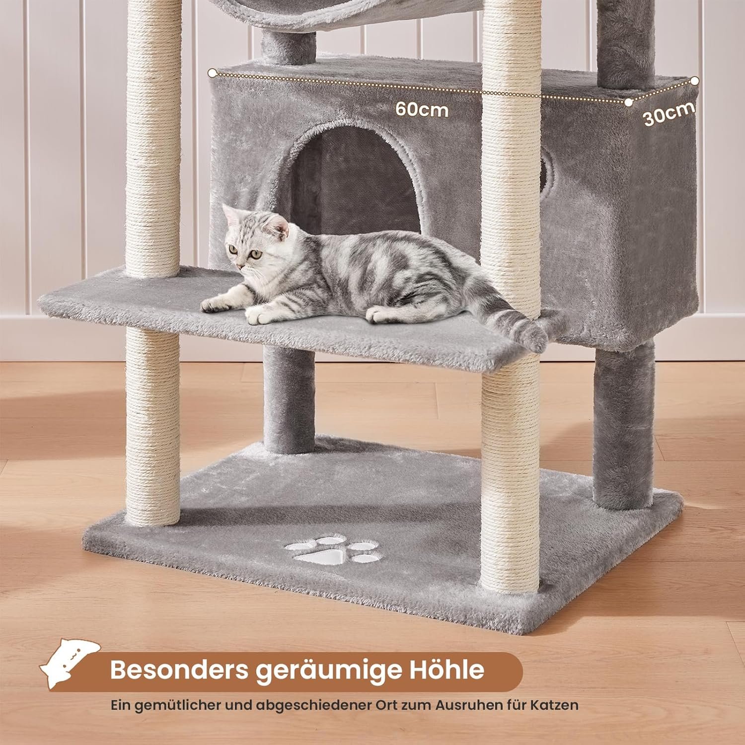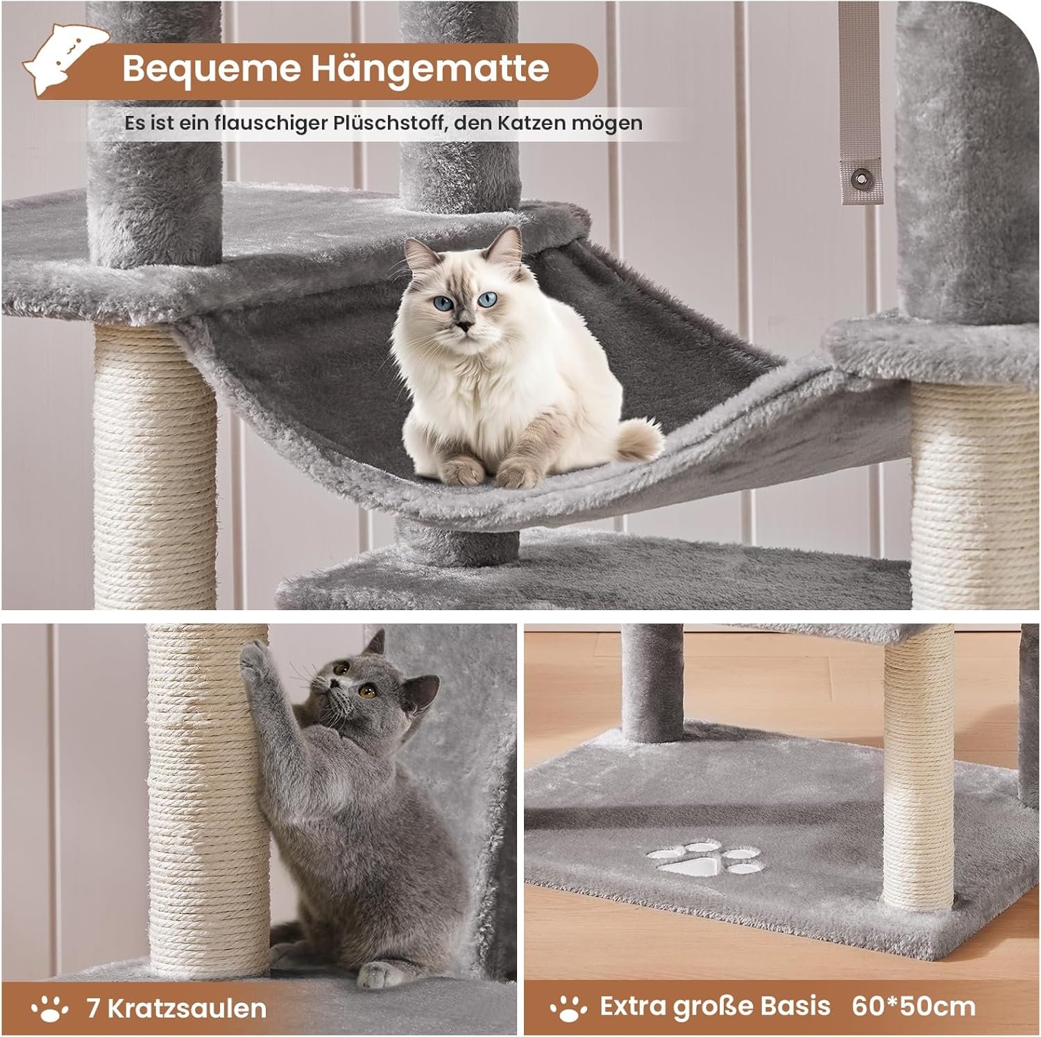 Stabilität und Sicherheit stehen an erster Stelle: Dieses Kletterparadies wird von robusten Sisalpfosten und einer verstärkten Bodenplatte (60 cm x 50 cm) getragen. Sicher und robust – auch für aktive Kletterer. Für zusätzliche Sicherheit sind Kippschutzbeschläge im Lieferumfang enthalten.
