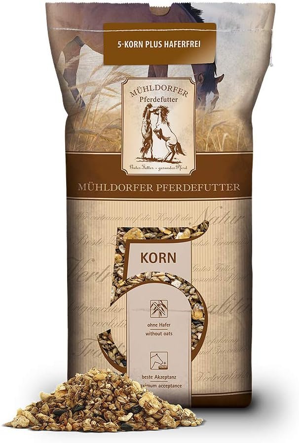 Das Mühldorfer 5-Korn plus Haferfrei ist ein haferfreies Allroundtalent für alle Freizeit- und Sportpferde. Um eine umfassende Versorgung mit lebenswichtigen Vitaminen, Mineralstoffen und Spurenelementen zu gewährleisten, enthält Mühldorfer 5-Korn Plus neben den organisch gebundenen Vitalstoffen nativen Ursprungs auch Mineralisierung und Vitaminisierung. Durch die differenzierte Verdauung des Getreides im 5-Korn Plus erfolgt die Energiebereitstellung periodisch nach der Futteraufnahme (kurz-, mittel-, langfristig).