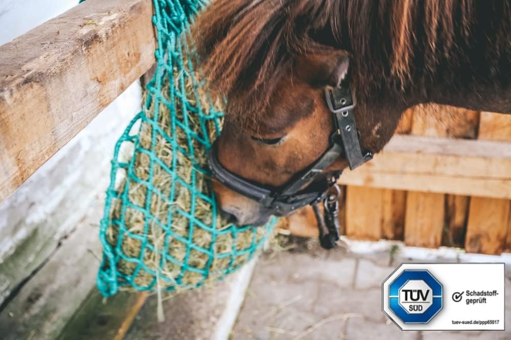 Mit Heunetzen von Konege verlängert ihr die Fresszeit, dosiert die Heu menge aufs Kilo genau und sorgt für eine gesunde Nahrungsaufnahme. Essenziell dabei: die Wahl der perfekten Maschenweite – die ist nämlich bei jedem Pferd individuell zu bestimmen sowie im Laufe der Zeit gegebenenfalls zu reduzieren.